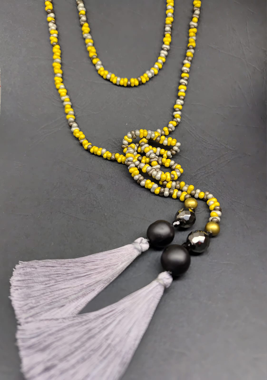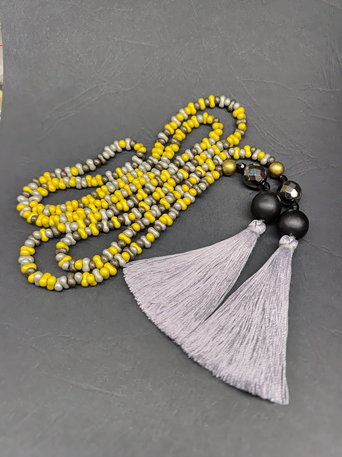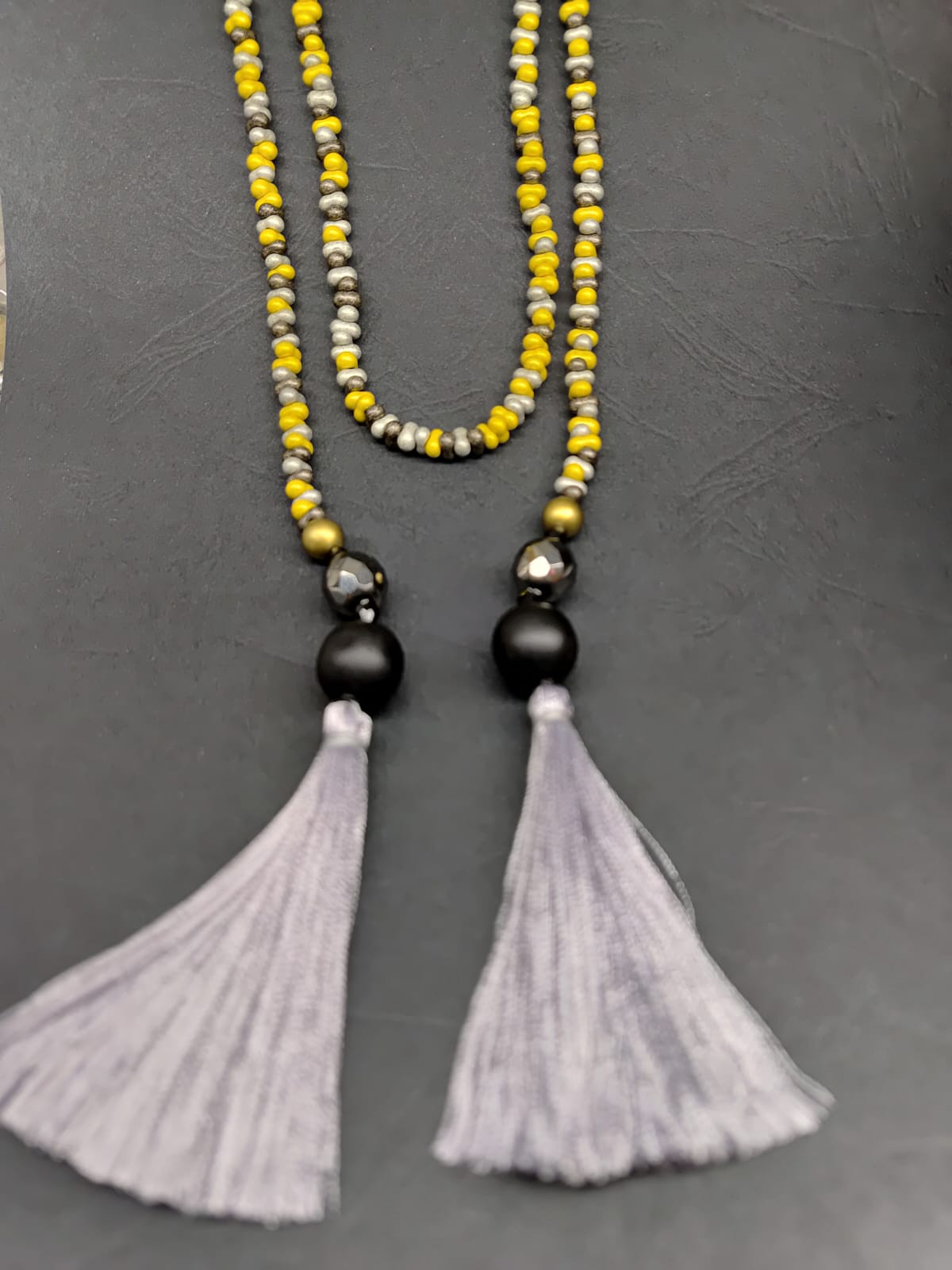 Naszyjnik Długi Sznur Złoto Szare Korale Szklane z Chwostami