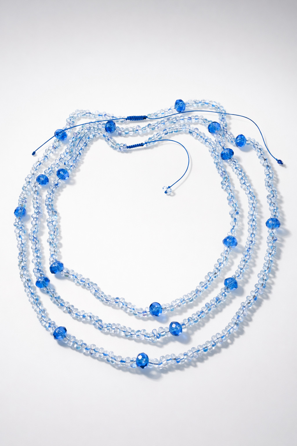 Dwa sznury korali niebieskich przeplatanych kryształkami dużymi 10 mm, efektowny naszyjnik, korale niczym kryształ mienią się i odbijają światło. Długość sznura długiego 45-52 cm, długość krótkiego sznurka 30-40 cm