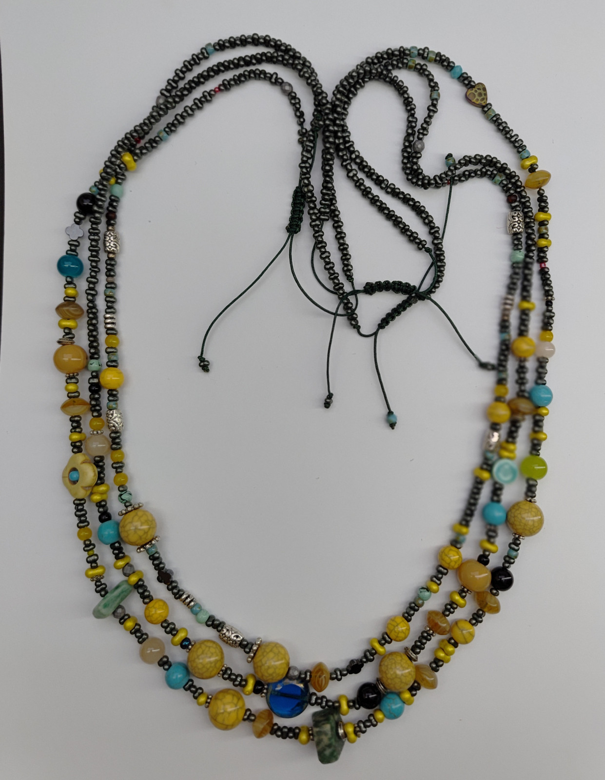 Naszyjnik składa się z trzech sznurów korali i kamieni różnych. Bardzo dekoracyjny żółty howlit, zielony kamień i grafitowy howlit, a to wszystko przeplatane koralikami szklanymi w metalizowanym lekko zielonkawym kolorze. przekładki bali metalowe uzupełniaja całość. Sznury długie 38, 45 cm i każy posiada mała regulacje.