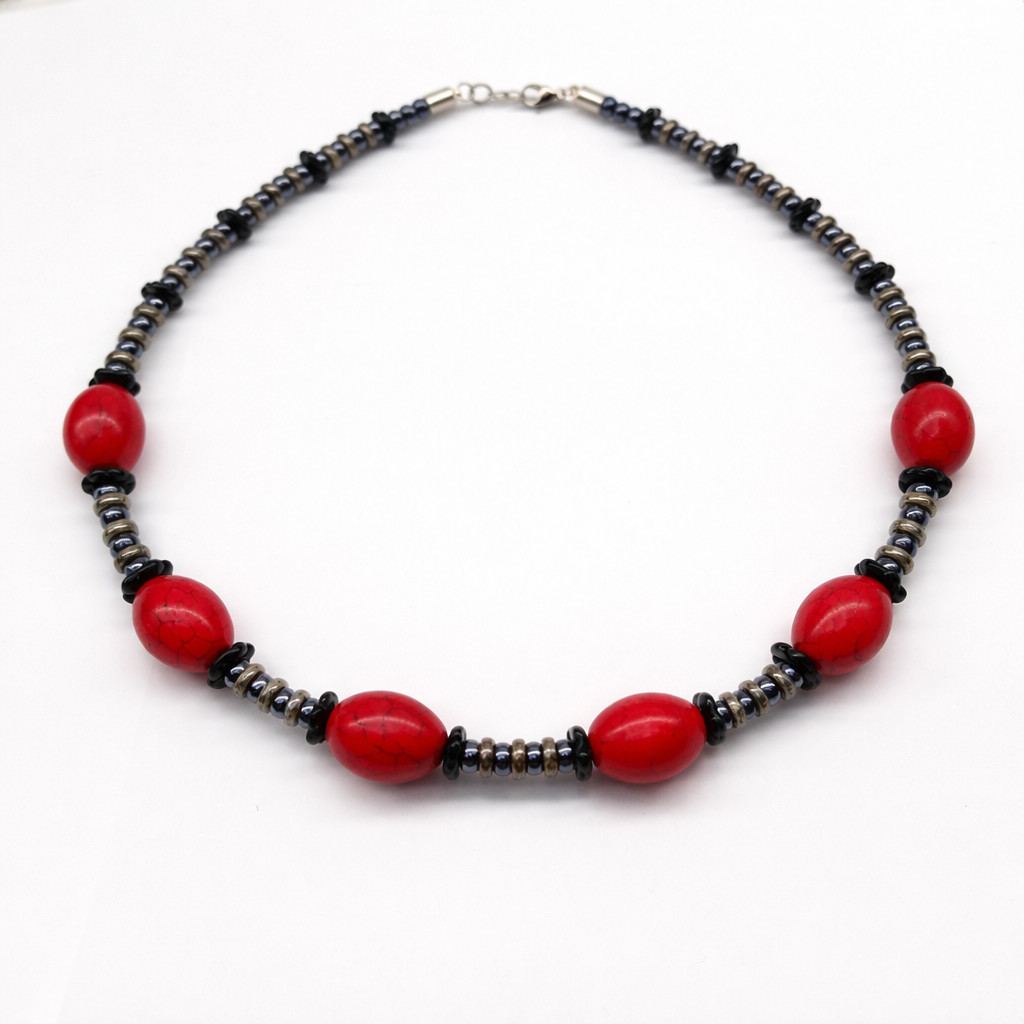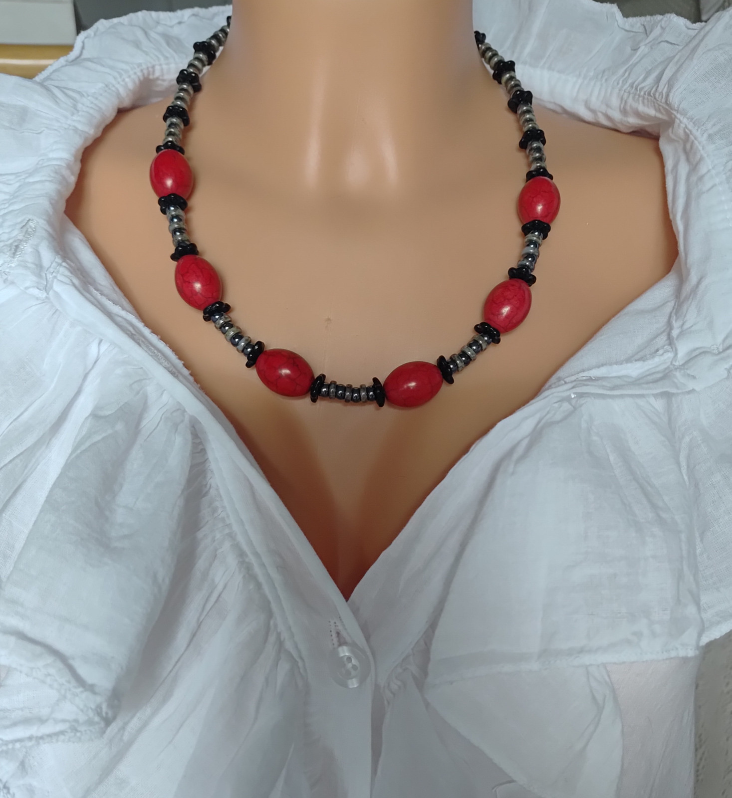 Eleganckie korale z czerwonym akcentem - klasyczna biżuteria handmade. Stylowe korale stworzone z myślą o kobietach, które cenią wyrazistą, a jednocześnie elegancką biżuterię. Główną ozdobę stanowią czerwone korale oliwki howlitu o subtelnym połysku, które przyciągają wzrok i dodają charakteru każdej stylizacji. Towarzyszą im drobne koraliki w odcieniach grafitu i czerni, tworzące harmonijny kontrast oraz podkreślające głębię koloru. Sprawdzi się zarówno na co dzień, jak i na specjalne okazje. Doskonale komponuje się z klasyczną czernią, bielą, szarościami oraz stylizacjami w stylu boho czy eleganckim.