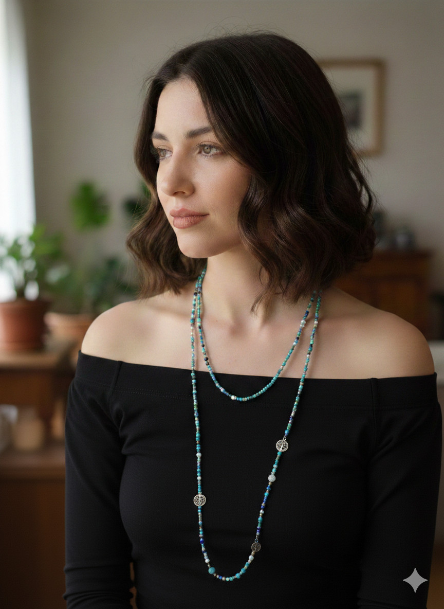 Paleta barw: Dominują tu odcienie turkusu, morskiej zieleni i głębokiego błękitu, przeplatane mniejszymi koralikami w kolorze białym, srebrnym i piaskowym. To zestawienie kojarzy się z kolorami oceanu lub lasu po deszczu.