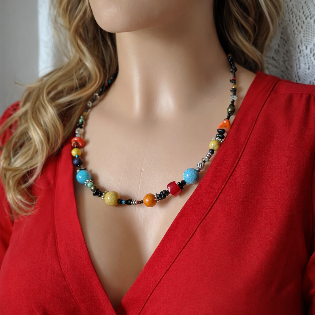 Naszyjnik jest pełen żywych, intensywnych barw, które tworzą niesamowitą mozaikę, a wzór jest odważny i niepowtarzaalny. Moja wyobraznia nie miała żadnych granic, dzięki czemu powstał naprawdę unikalny i intrygujący dodatek do kreacji w stylu boho. Howlity, korale, kamyki inne i szkło. Objętość 53 cm