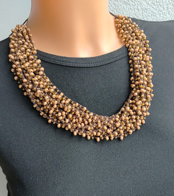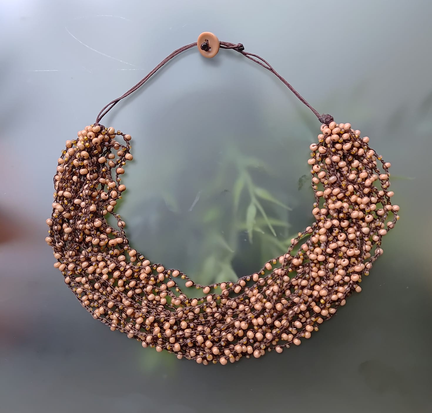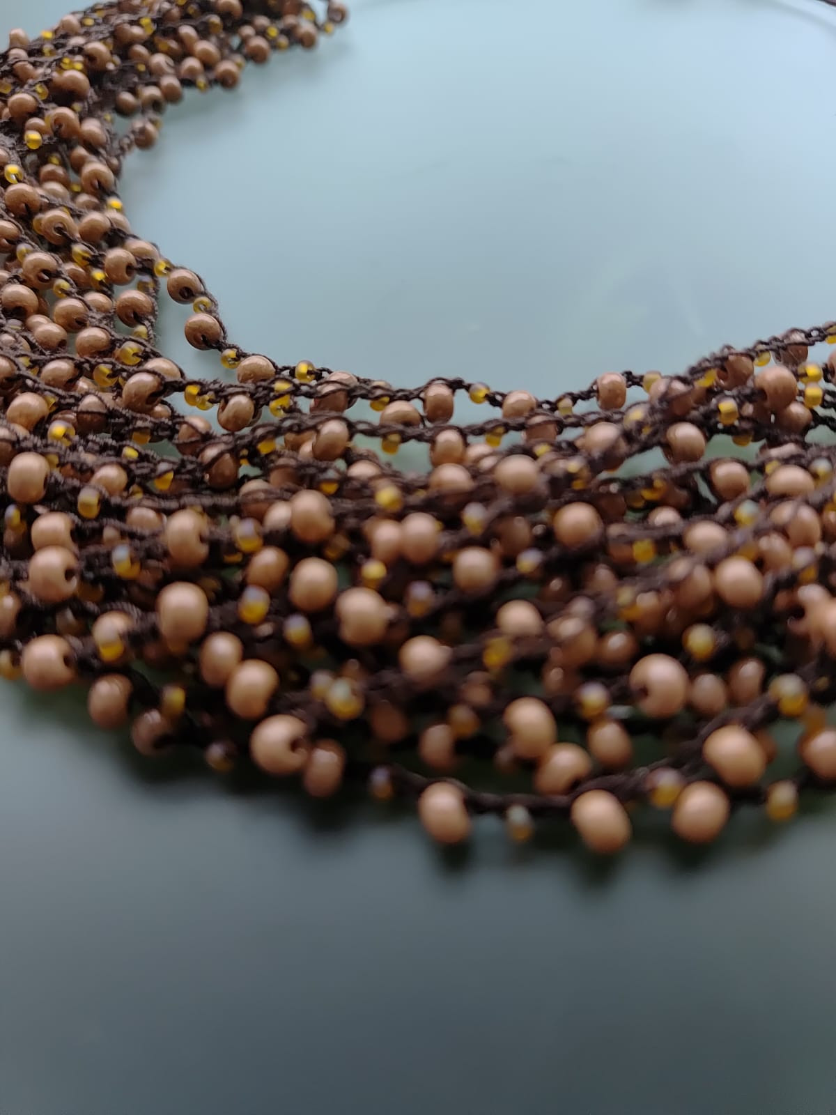 Naszyjnik wielonitkowy z dużą ilością koralików szklanych czeskich w kolorze karmelowym. Naszyjnik lekki mimo dużej ilości koralików, koraliki są drobne 3 mm. Wykończenie minimalistyczne, bez użycia metalu. Sznurek syntetyczny. Delikatny, lekki, do każdej stylizacji. Długość naszyjnika po zapięciu 26 cm