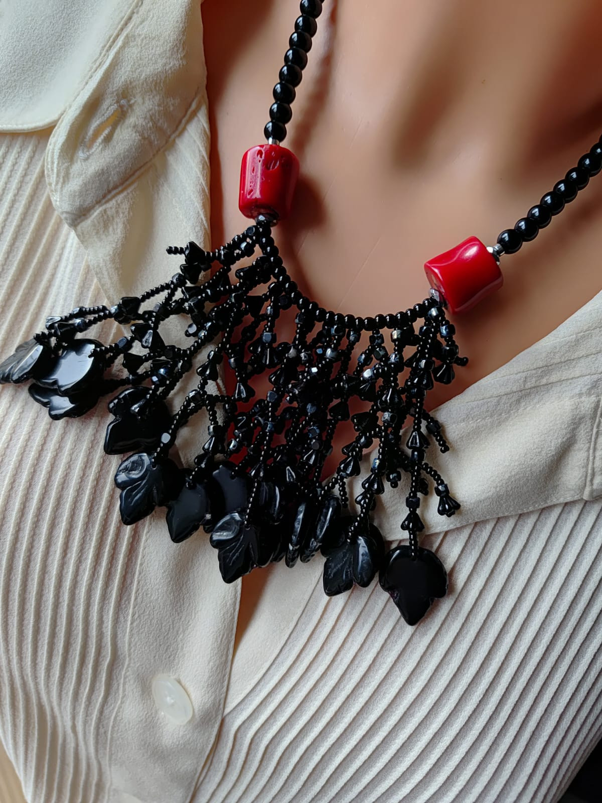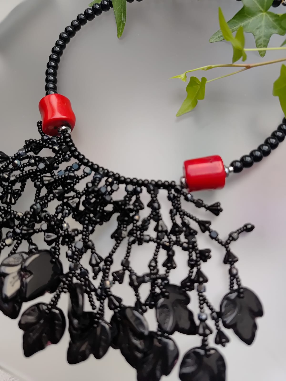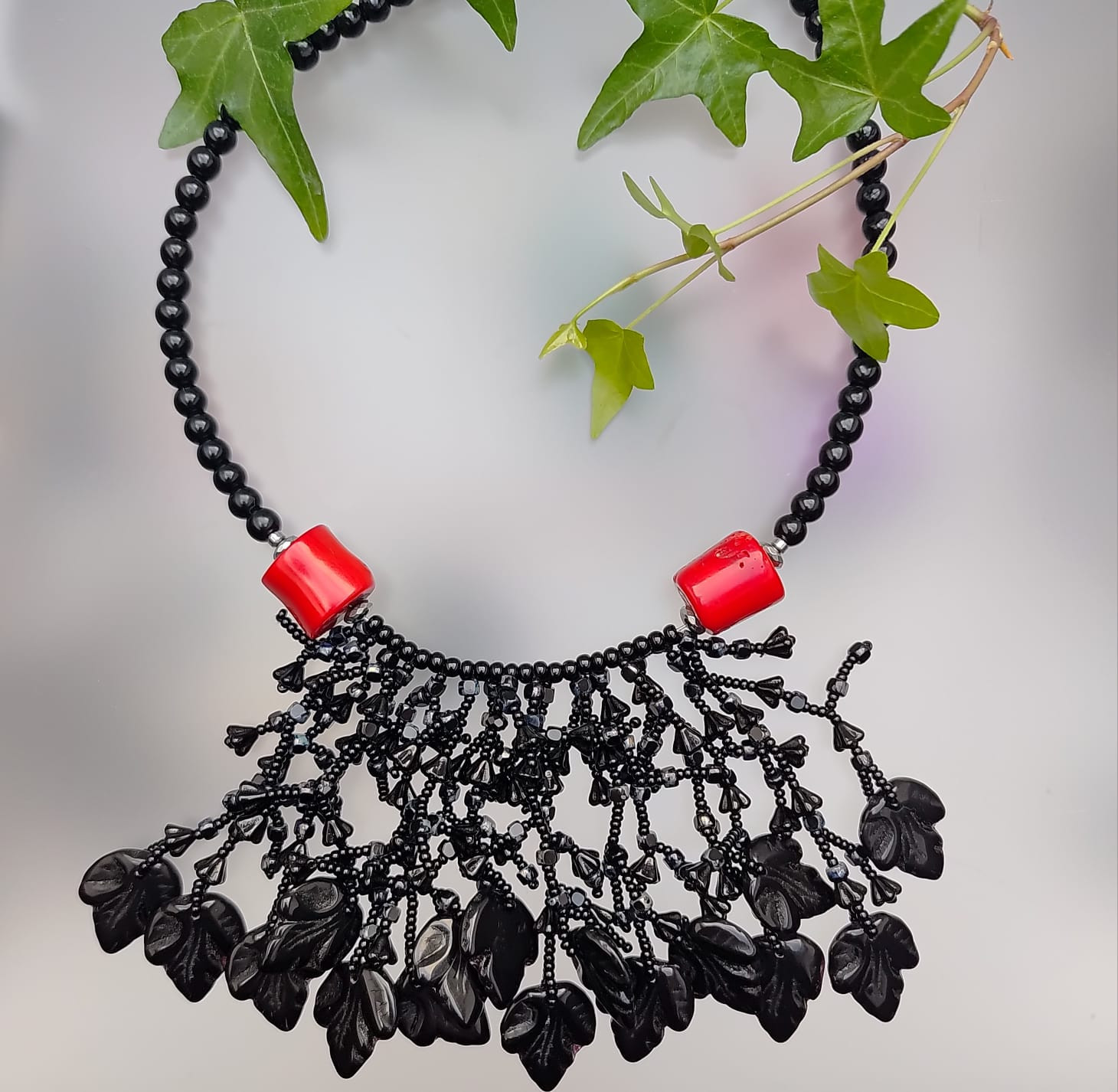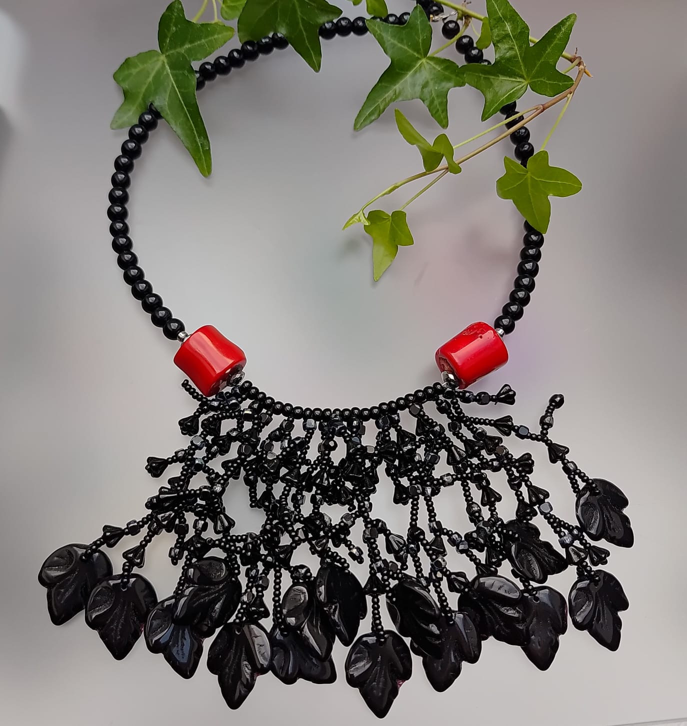 Naszyjnik piękna kaskada, mix szklanych czarnych korali w kształcie liści i kwiatów. Wyrazny, efektowny pozostający w pamięci. Robi wrażenie. Duże wałeczki czerwonego korala. Naszyjnik ma objętość 40 cm, Szkło, stal