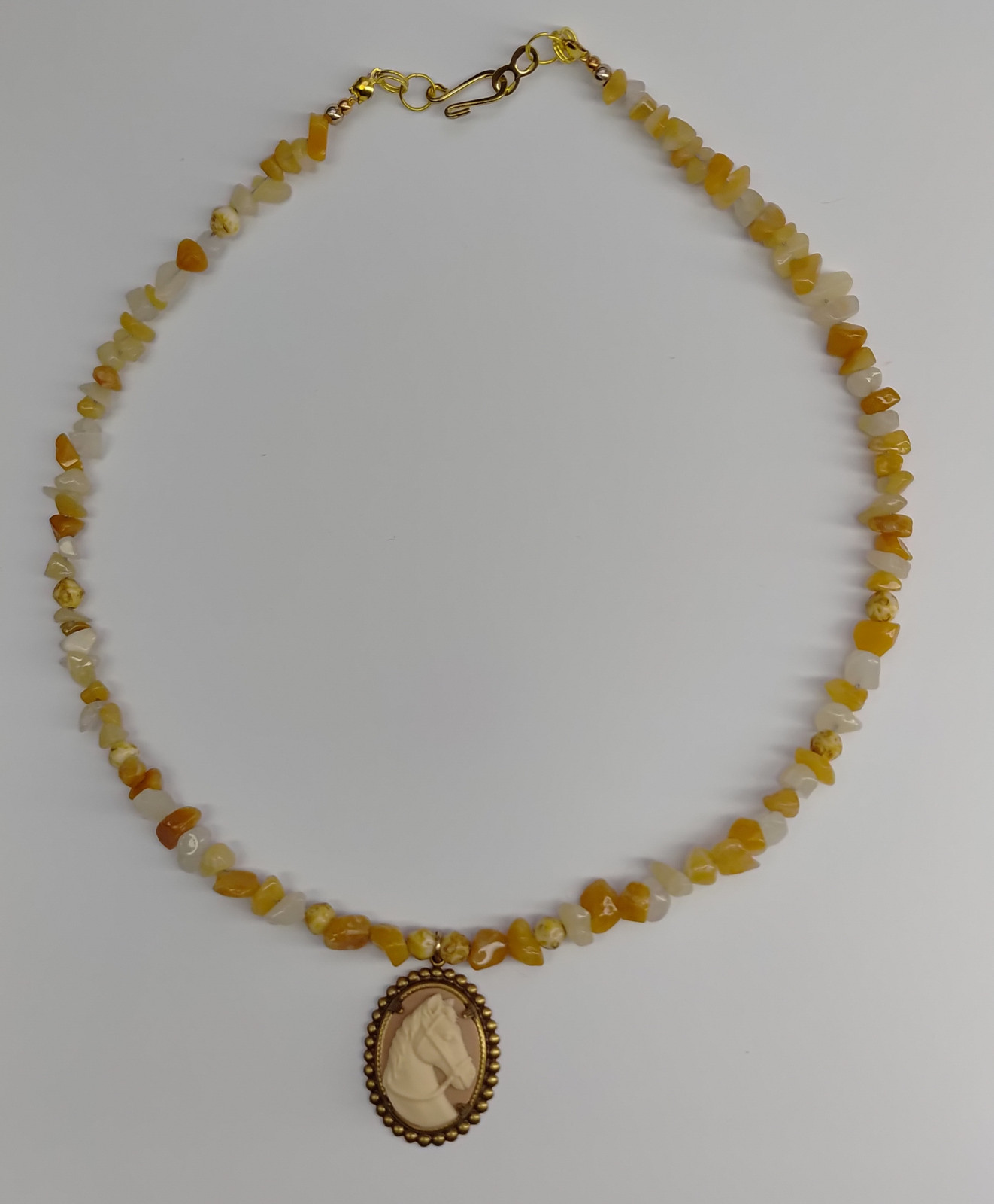 Naszyjnik krótki choker kamień naturalny karneol bryłki z domieszką małych kulek szklanych koralików imitujących trawertyn. Karneol jest podkreśleniem wisiorka w podobnym kolorze. Piękna camea z głową konia w mosiężnej oprawie. Wisiorek 3,5 cm, Długość naszyjnika 25 cm