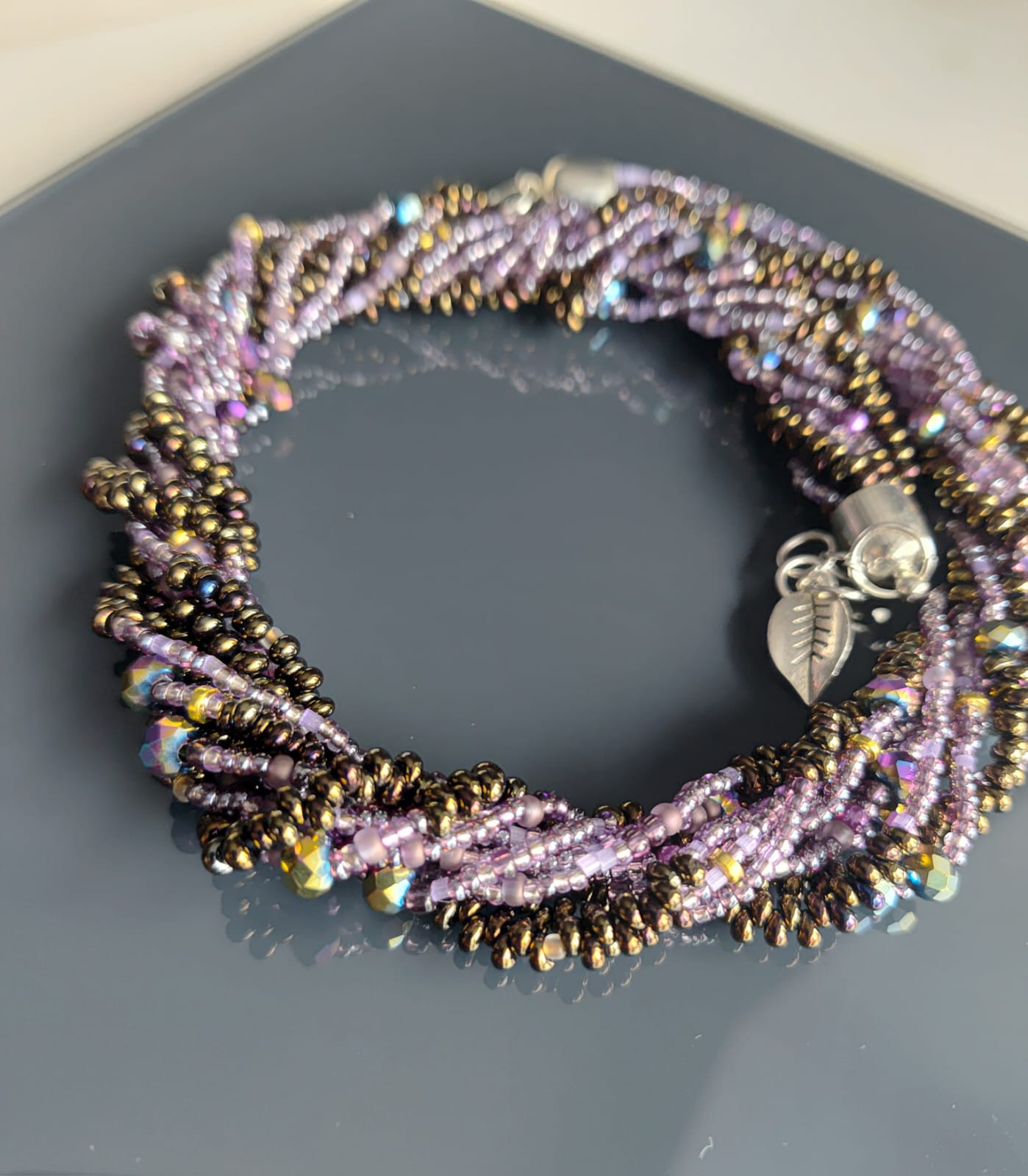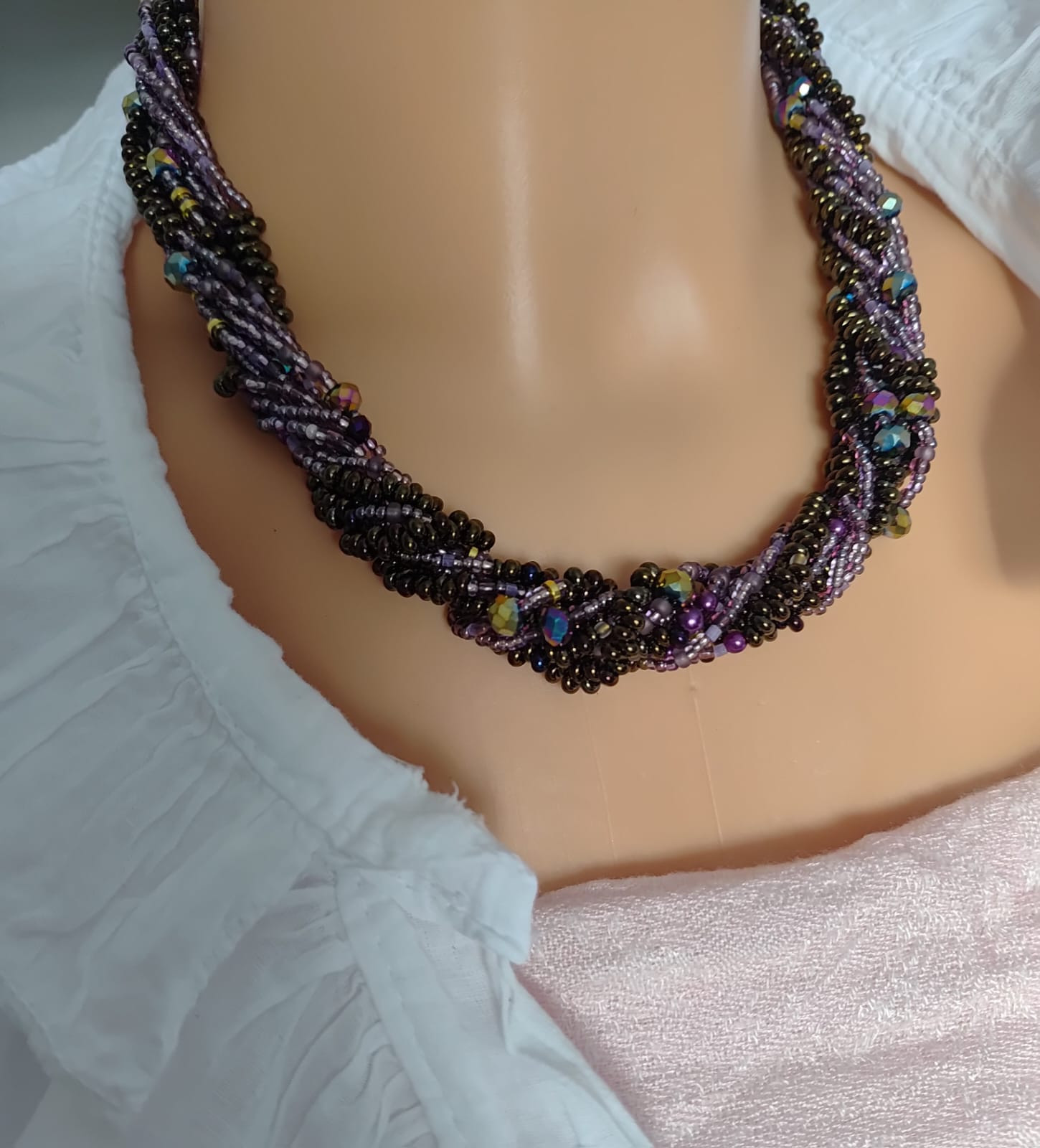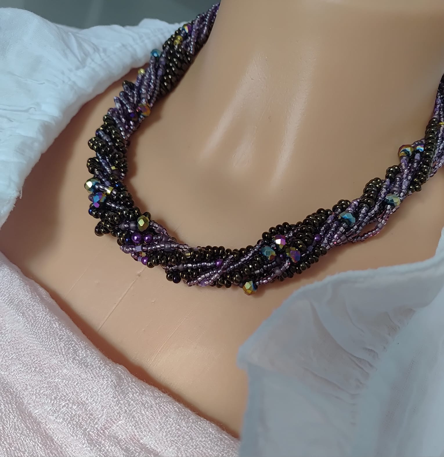 Naszyjnik krótki z koralików kropelek metalizowanych czeskich i fioletowych kryształków szklanych 6 mm, Końcówki i zapięcie ze stali nierdzewnej. Naszyjnik ma objętość 44-46 cm