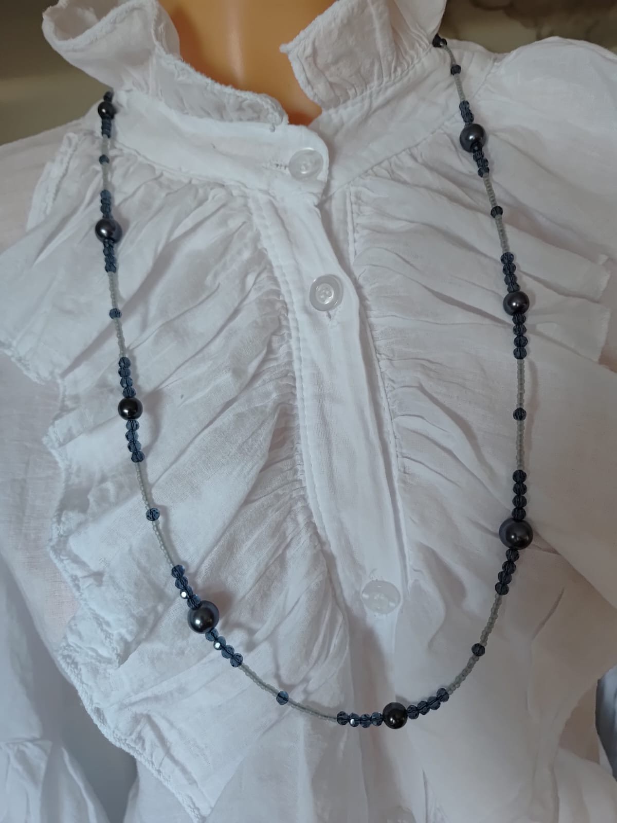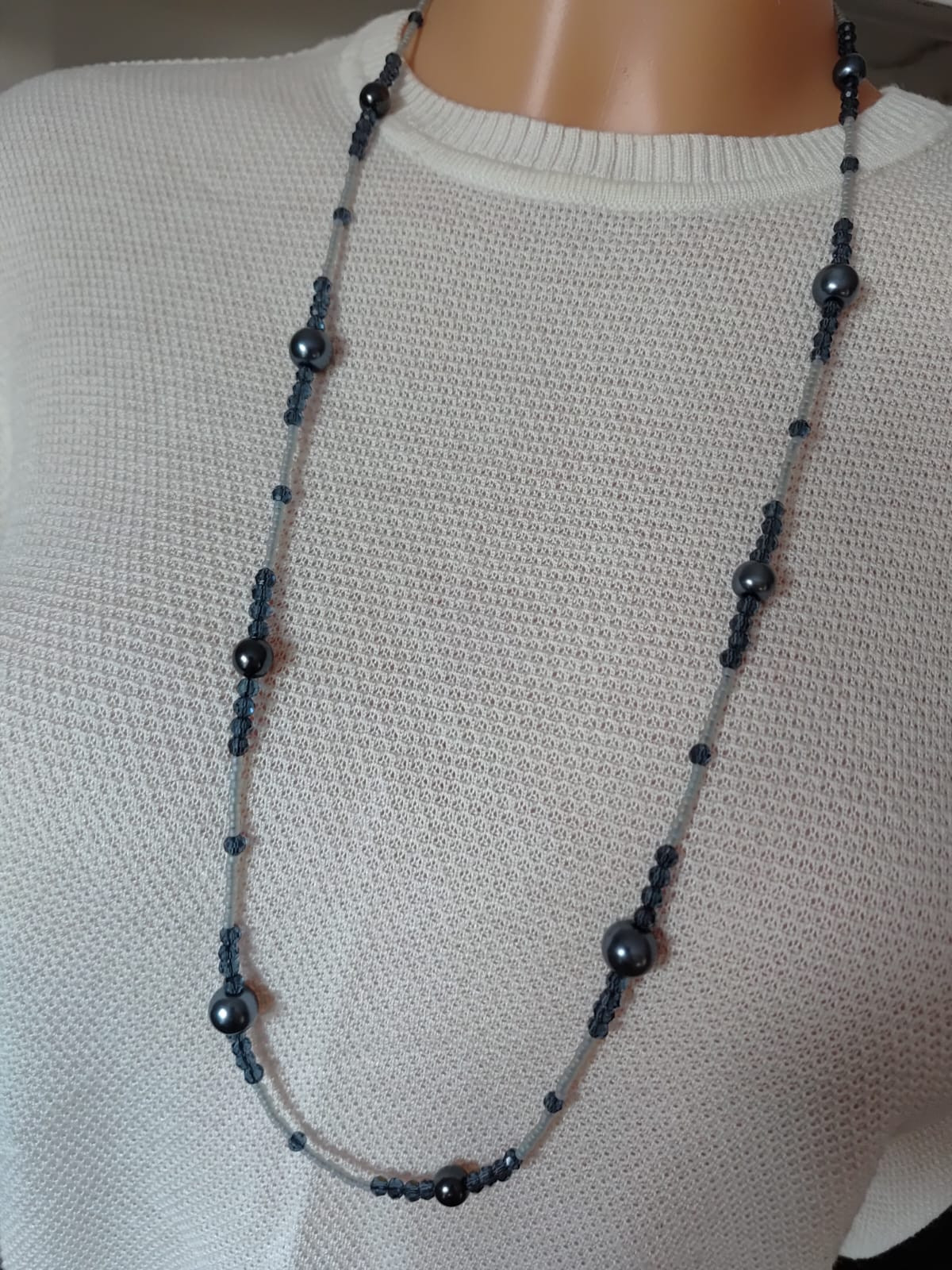 Długi sznur korali perłowych i kryształków szklanych. Perła grafit 6 i 10 mm, Sznur korali na sznurku syntetycznym. Wygodne zakładanie dla osób starszych przez głowę bez zapięcia. Długość sznura 40 cm