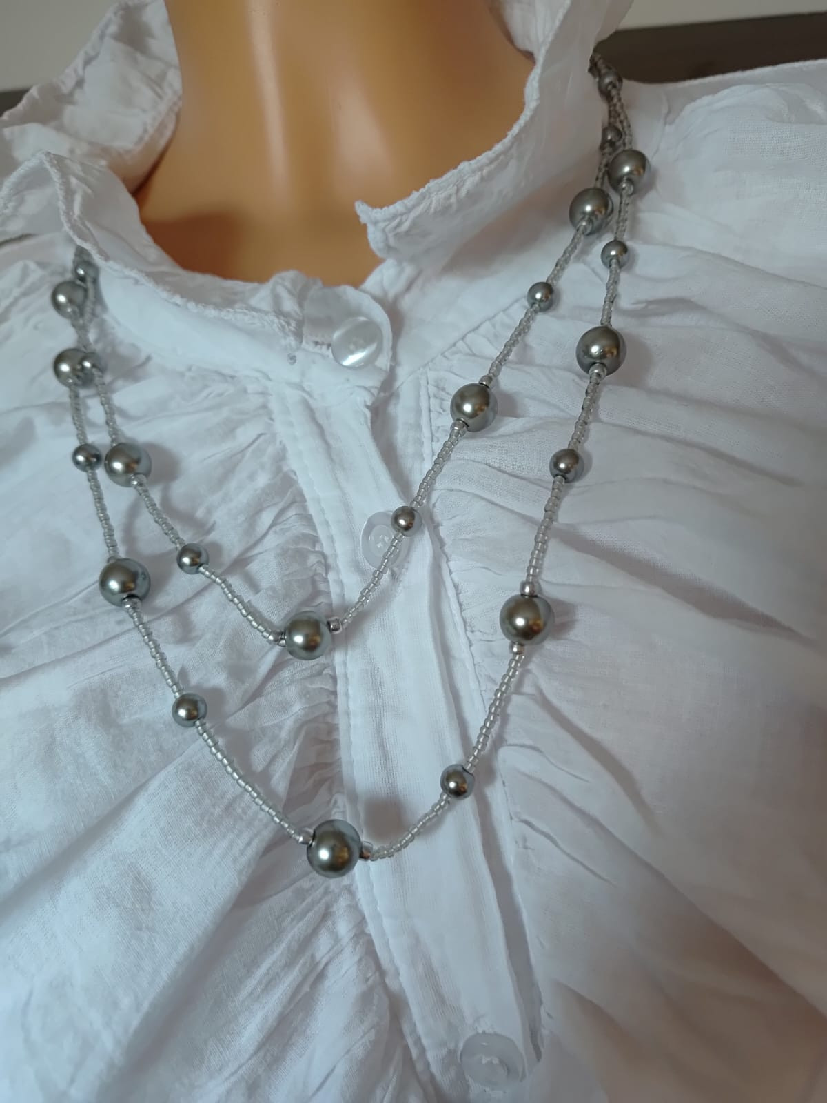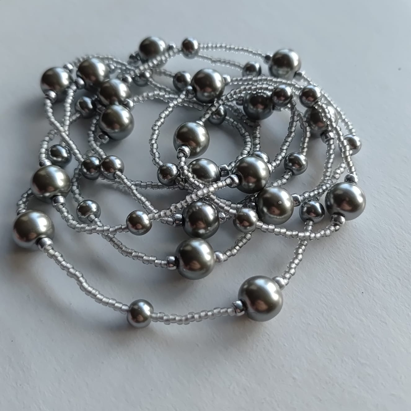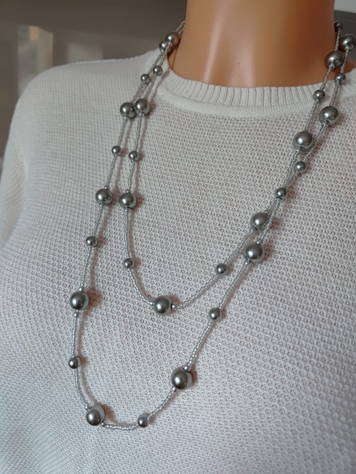 Długi sznur korali perłowych i drobnych koralików japońskich w szarym kolorze. Perła szara 6 i 10 mm, Sznur korali na sznurku syntetycznym. Wygodne zakładanie dla osób starszych przez głowę bez zapięcia. Długość sznura 65 cm, można dwukrotnie owinąć wokół szyi