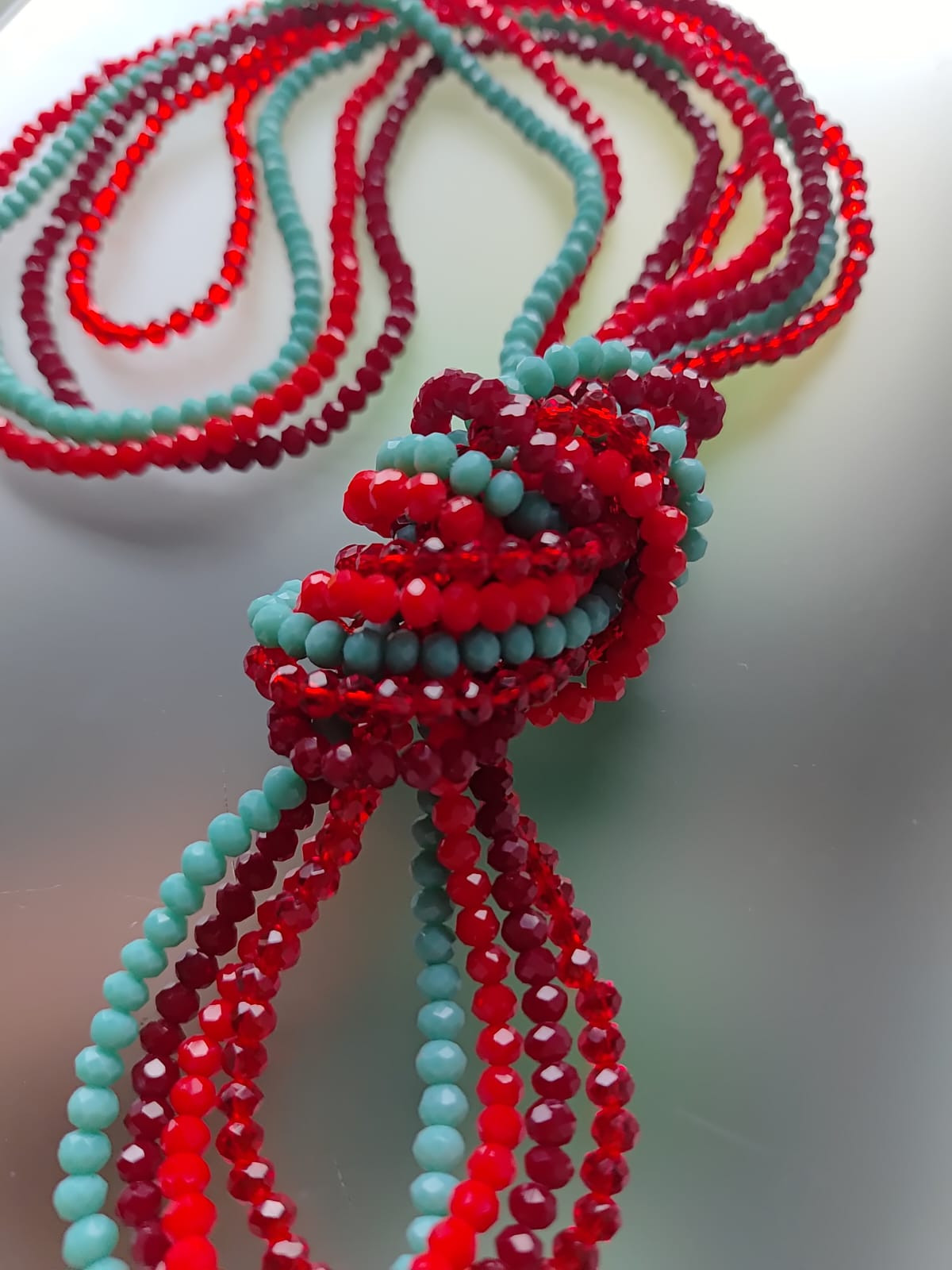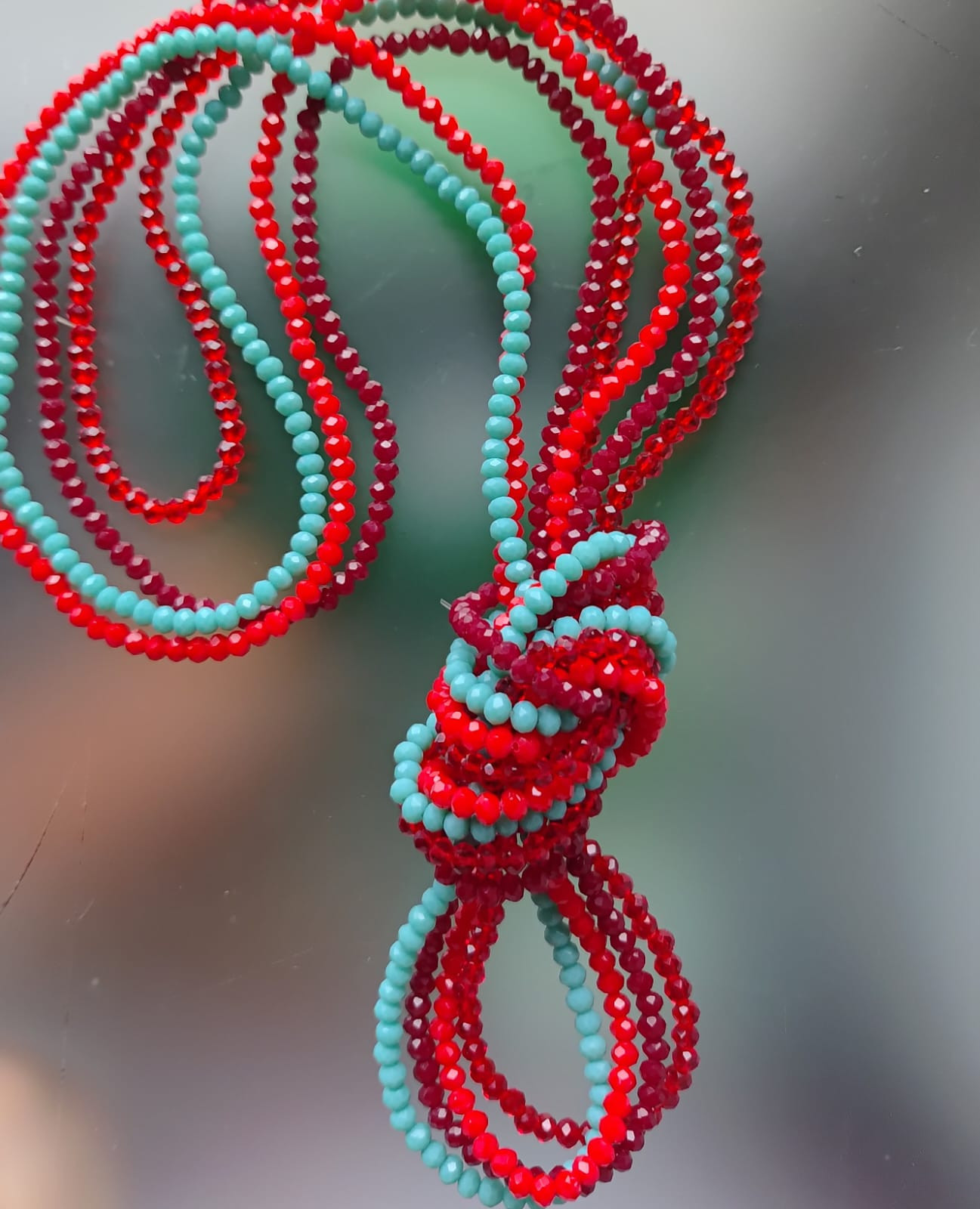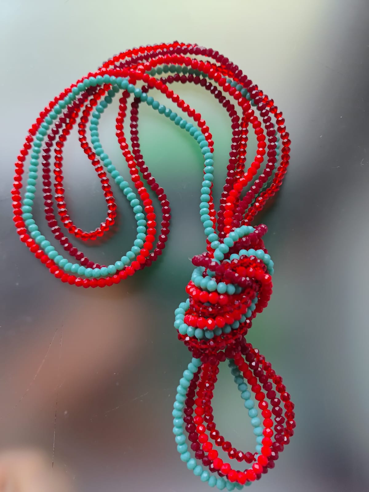 Naszyjnik, korale na gumce. Cztery sznury kryształków szklanych fasetowanych w kolorach czerwonym i turkusowym. Każdy sznur inny, każdy można nosić oddzielnie na szyi lub jako bransoletke. Piekna czerwień i niebieski turkus. Długość każdego sznura 50 cm