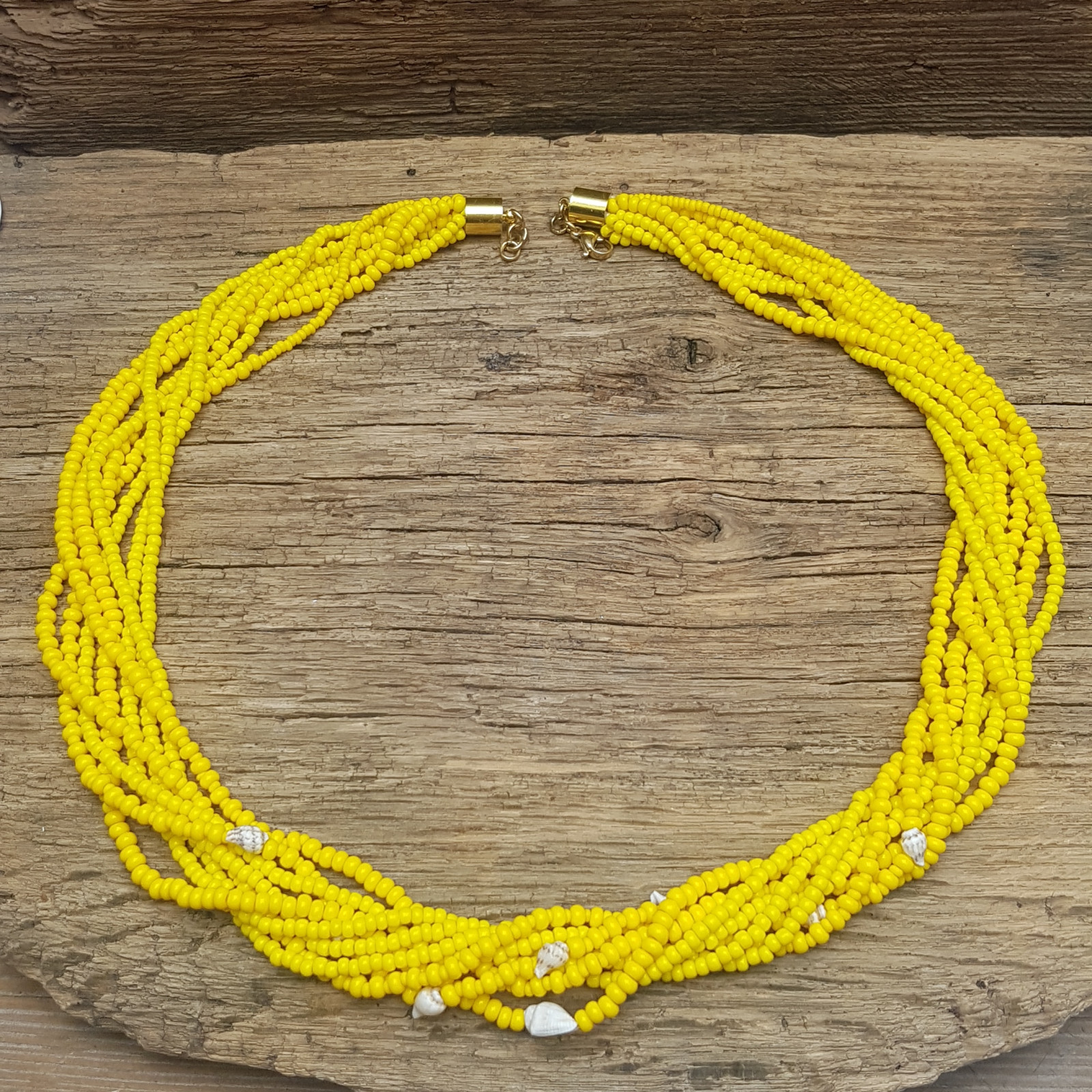 Naszyjnik złożony z ośmiu nitek żółtych koralików. Piekny słoneczny kolor naszyjnika przywołuje na myśl lato. W koraliki wplecione maleńkie muszelki. Pięknie będzie się komponował z letnimi kreacjami. Objętość 56 cm, końcówki metalowe w kolorze złotym, zapięcie karabńczyk ze stali