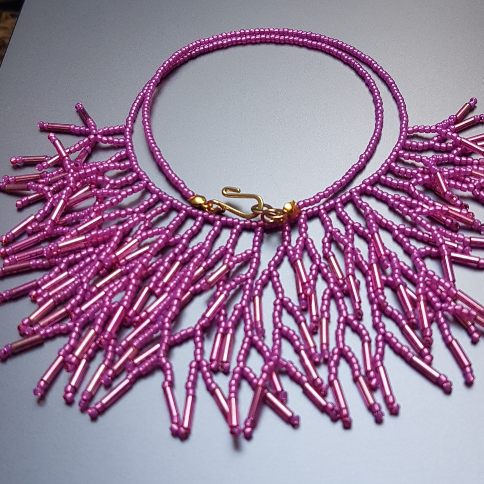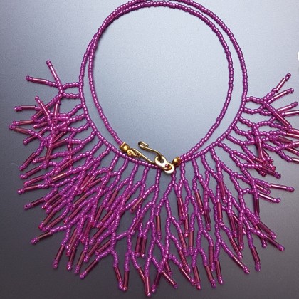 Naszyjnik z wysokiej klasy japońskich koralików 2 mm i rureczek 3 mm w kolorze różowym, gałazki z koralików są delikatne, naszyjnik jest lekki, wykończony końcówkami i zapięciem w kolorze zlotym, objętość 46 cm, zapiecie Haczyk ozdobny, objętość nie jest regulowana