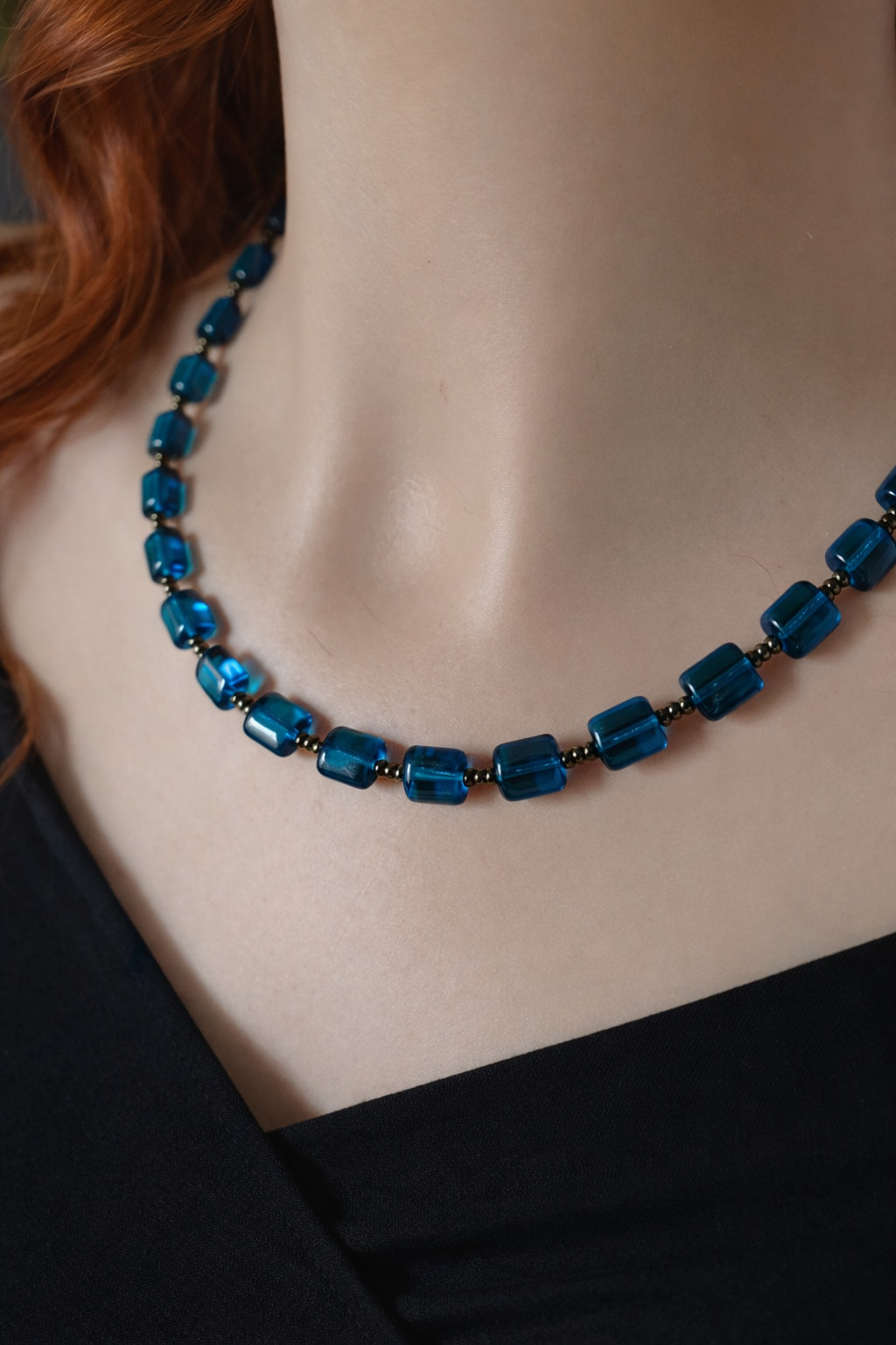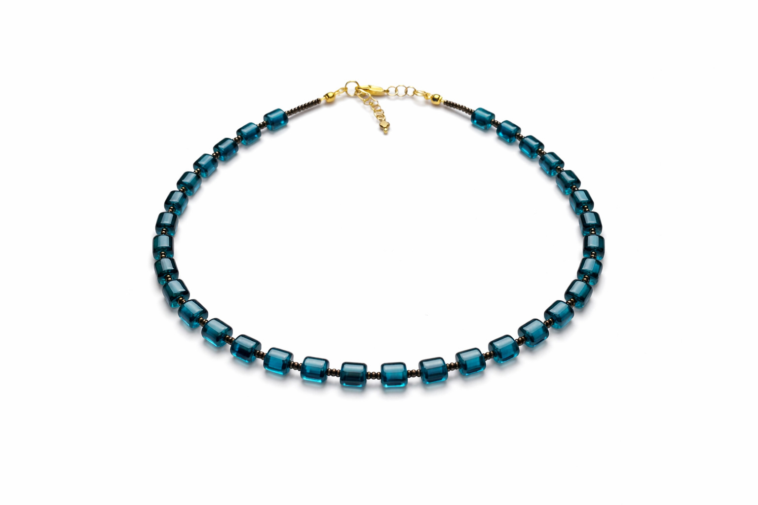 Naszyjnik składa się z koralików w odcieniu zielono niebieskim, przypominającym morskie barwy. Koraliki mają kształt obłych kostek, kwadratów, a pomiędzy nimi znajdują się metalizowane brązowe drobne koraliki, które dodają całości eleganckiego i subtelnego akcentu. Taki naszyjnik z pewnością przyciąga wzrok i świetnie pasuje do letnich stylizacji, ale z również sprawdzi się jako biżuteria wieczorowa. Objętość naszyjnika 41-42 cm
