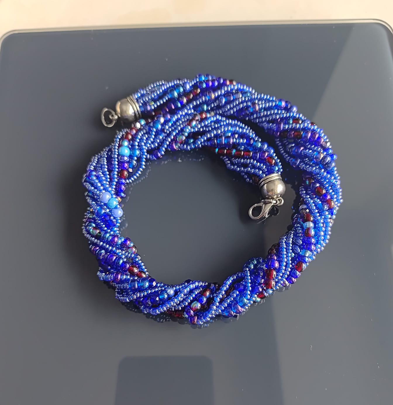 Naszyjnik krótki z koralików w odcieniach koloru niebieskiego z domieszką bordo, granatu, kryształków szklanych. Wykończenie ze stali nierdzewnej. Objętość naszyjnika wynosi 44 cm