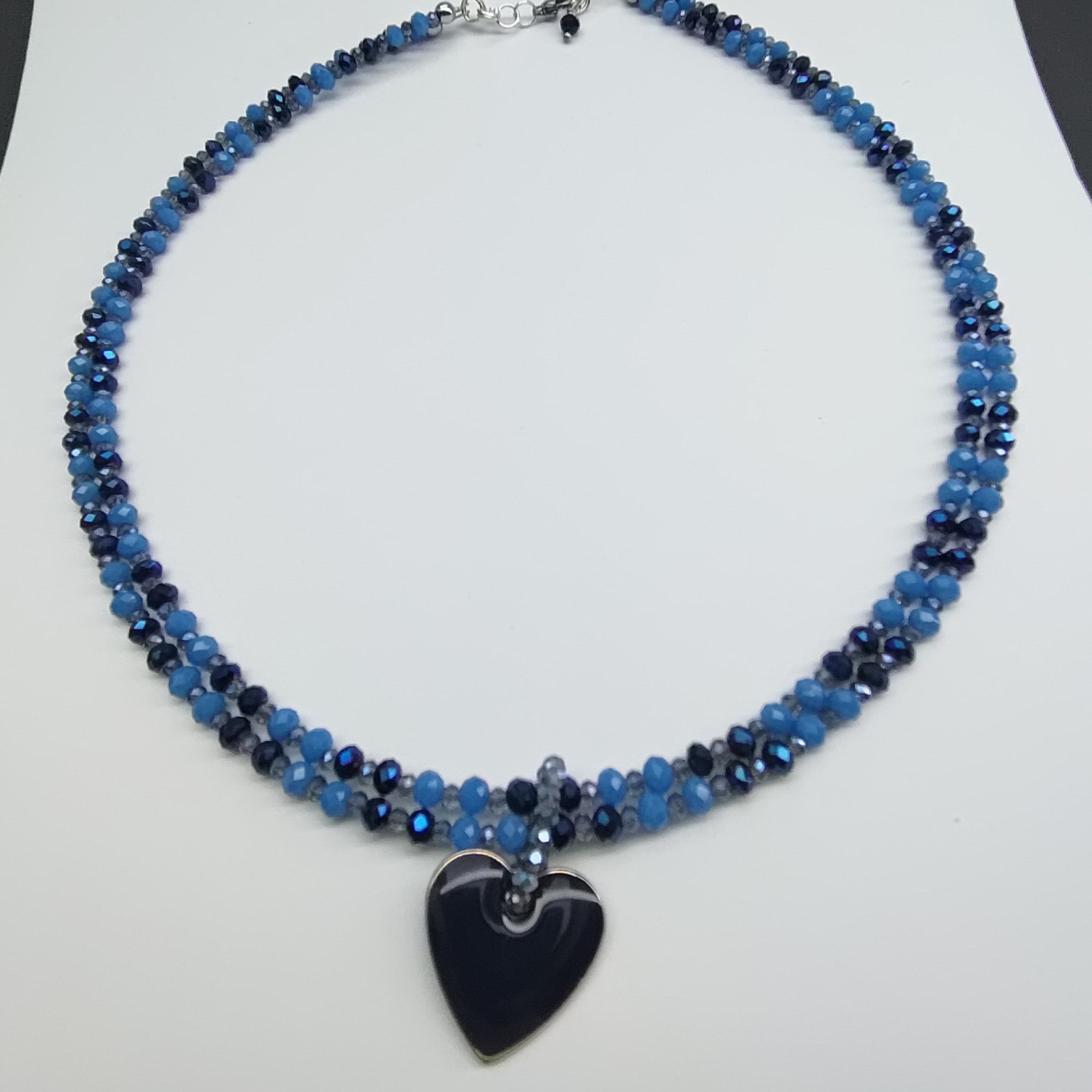 Naszyjnik z sercem. Krótkie koraliki na lince, kryształki szklane i serduszko szklane w oprawie. Długość 24 cm plus serduszko 2 cm