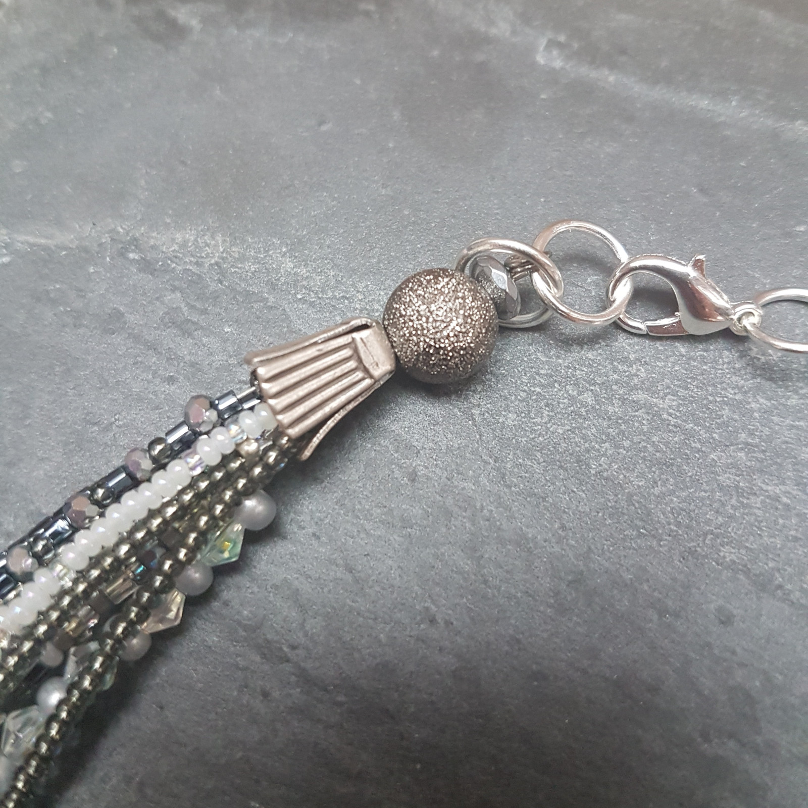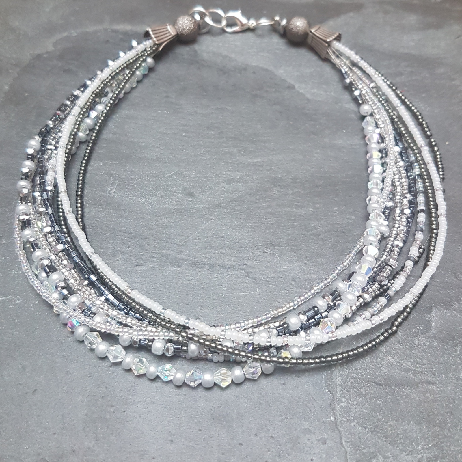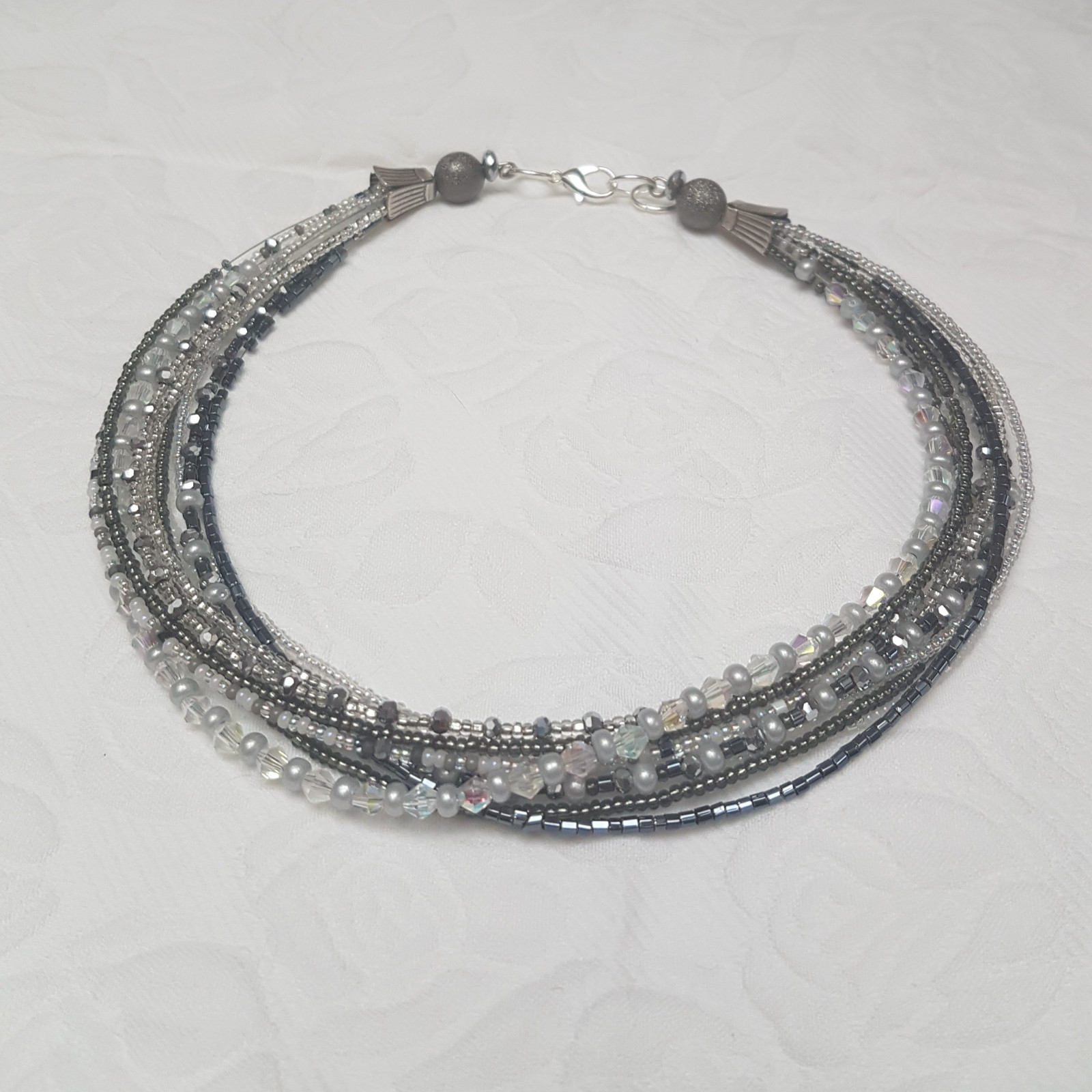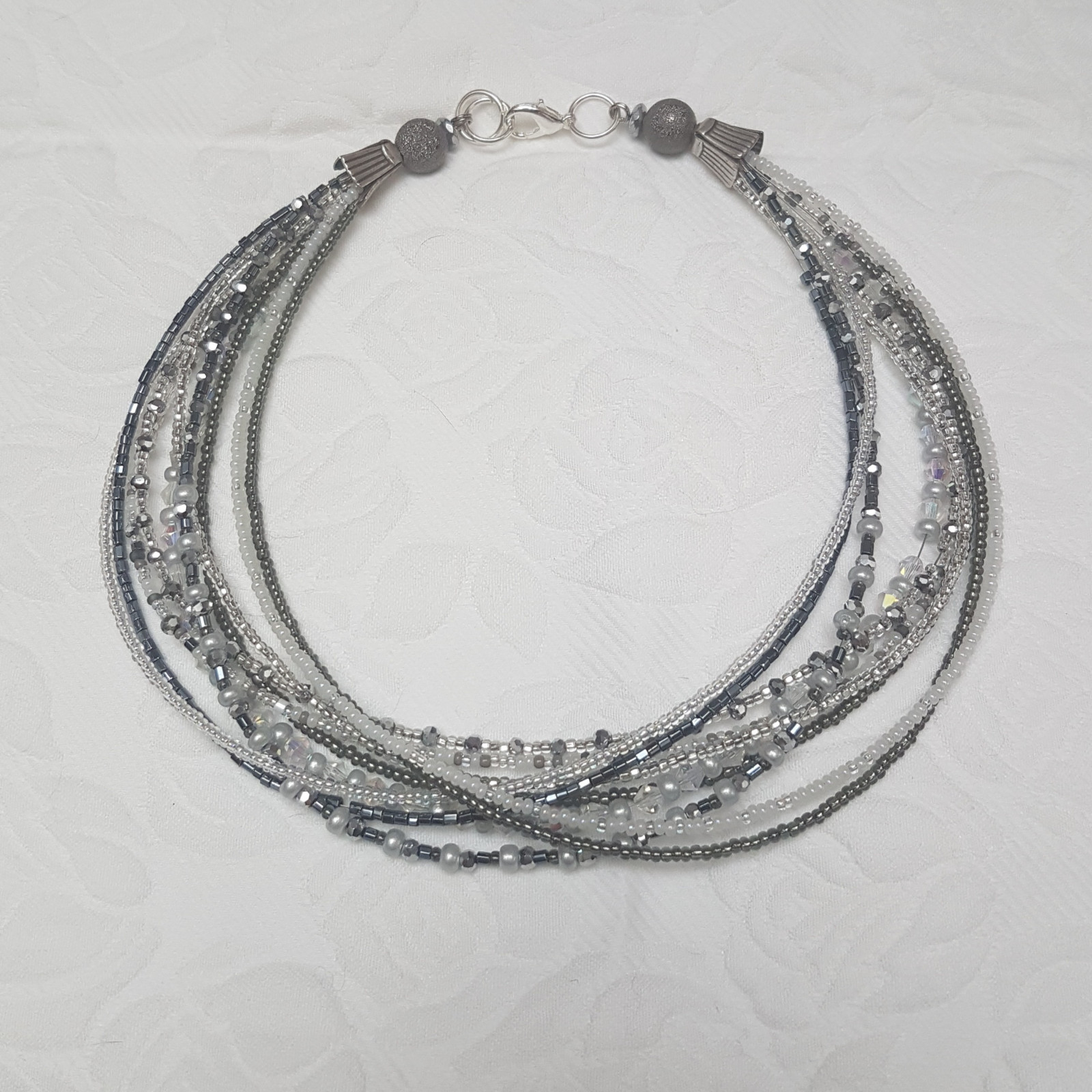 Szaro biało transparentny naszyjnik z drobnych koralików. Koraliki nanizane na bardzo cienką linkę jubilerską powlekaną. Dziesięć linek tworzy bardzo delikatny naszyjnik, mimo dużej ilości koralików jest lekki. Krótki, objętość 40 cm, koraliki ozdobione posrebrzanymi koszyczkami i kuleczkami z tzw pyłem księżycowym, malutkie fasetowane dyski hematytu, szkło, metal w kolorze srebrnym