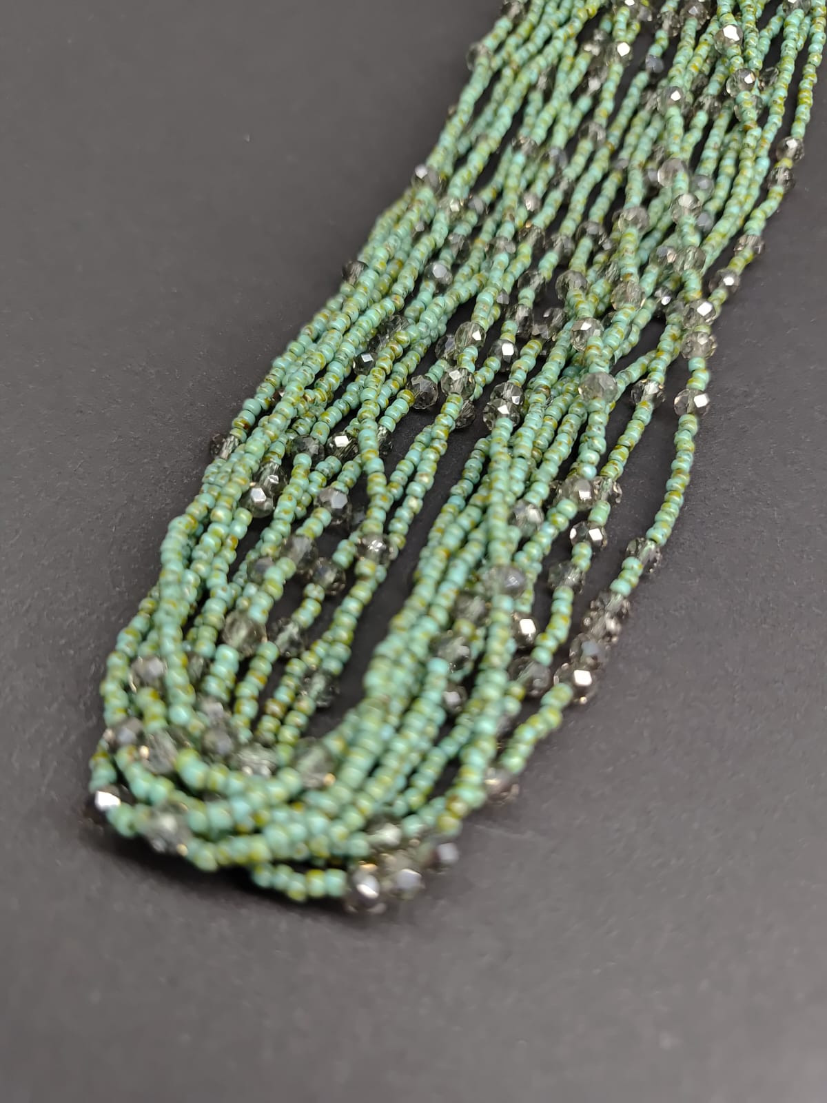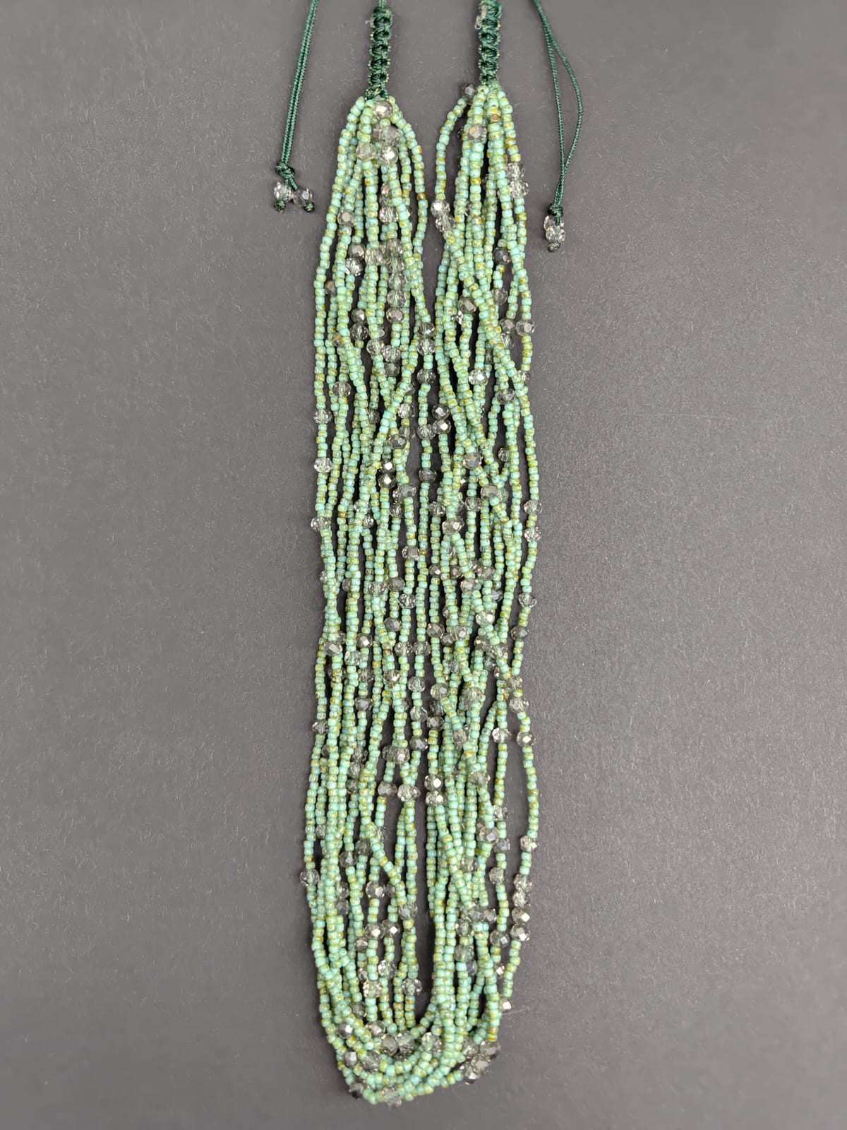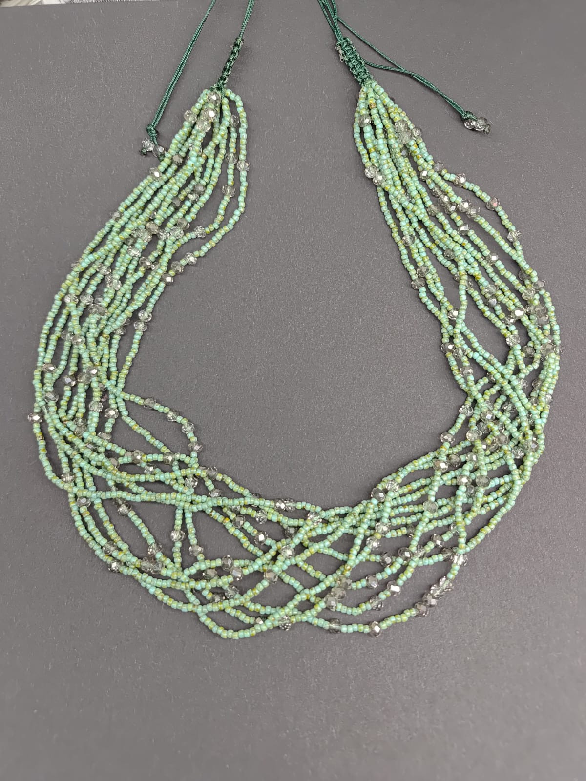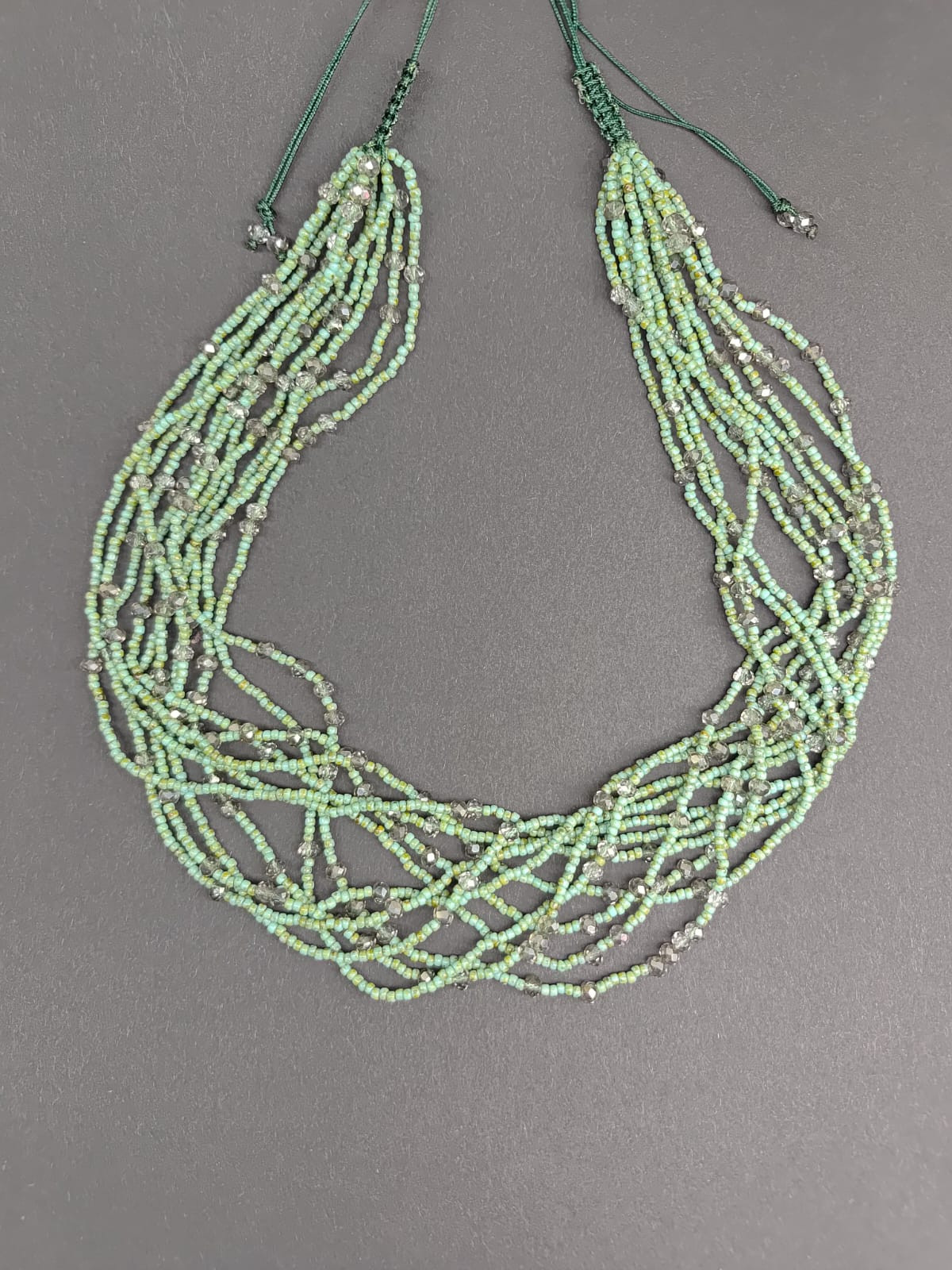 Naszyjnik z bardzo drobnych koralików w kolorze zielonego trawertynu, koraliki z przebarwieniami imitujące kamień. Szkło wysokiej klasy , japońskie szkło, dodatek to małe kryształki szklane z dymionego szkła 4 mm, Naszyjnik na sznurku syntetycznym , ścieg z makramy pozwala na regulację objętości od 46-62 cm