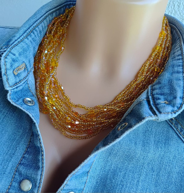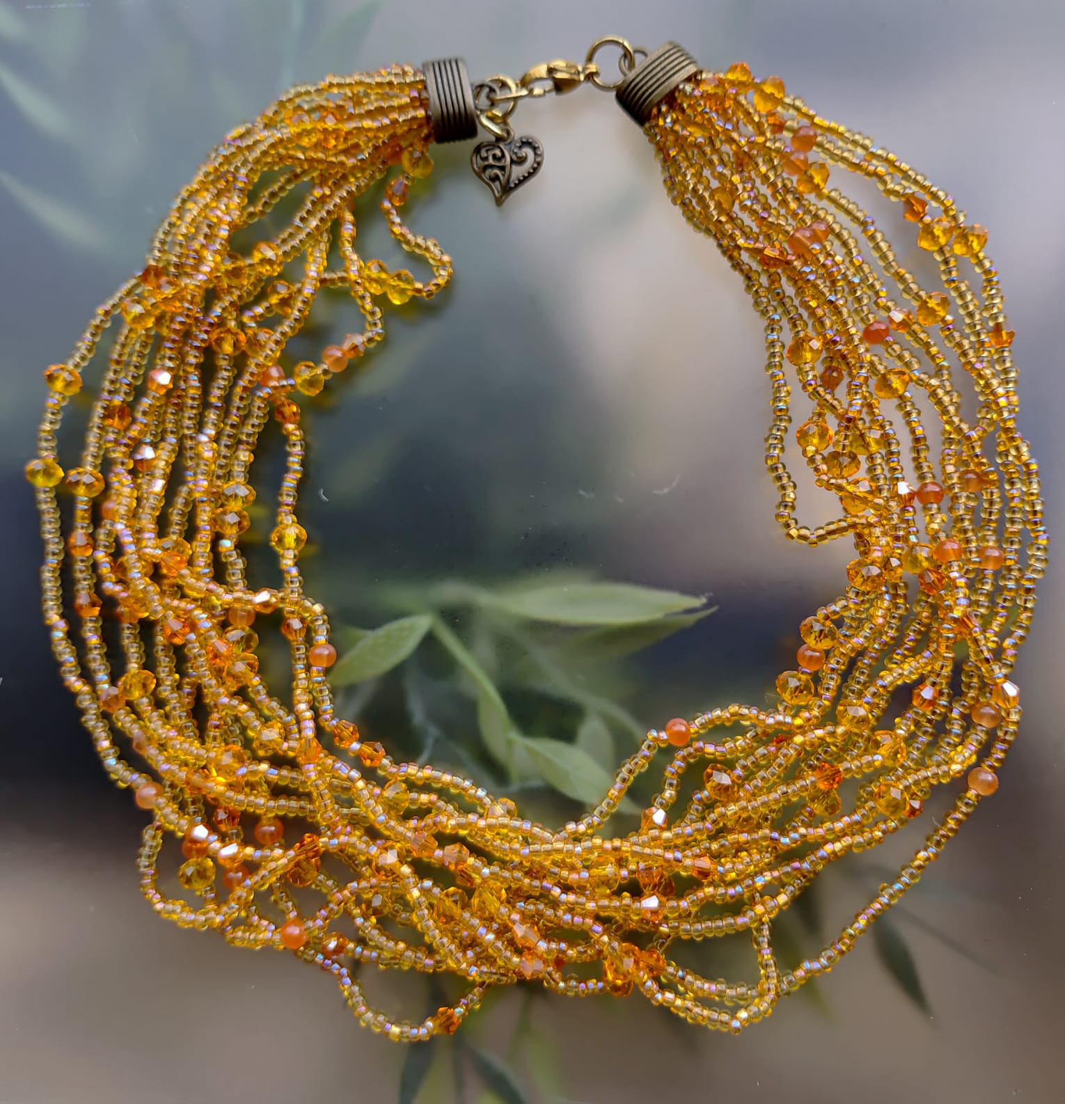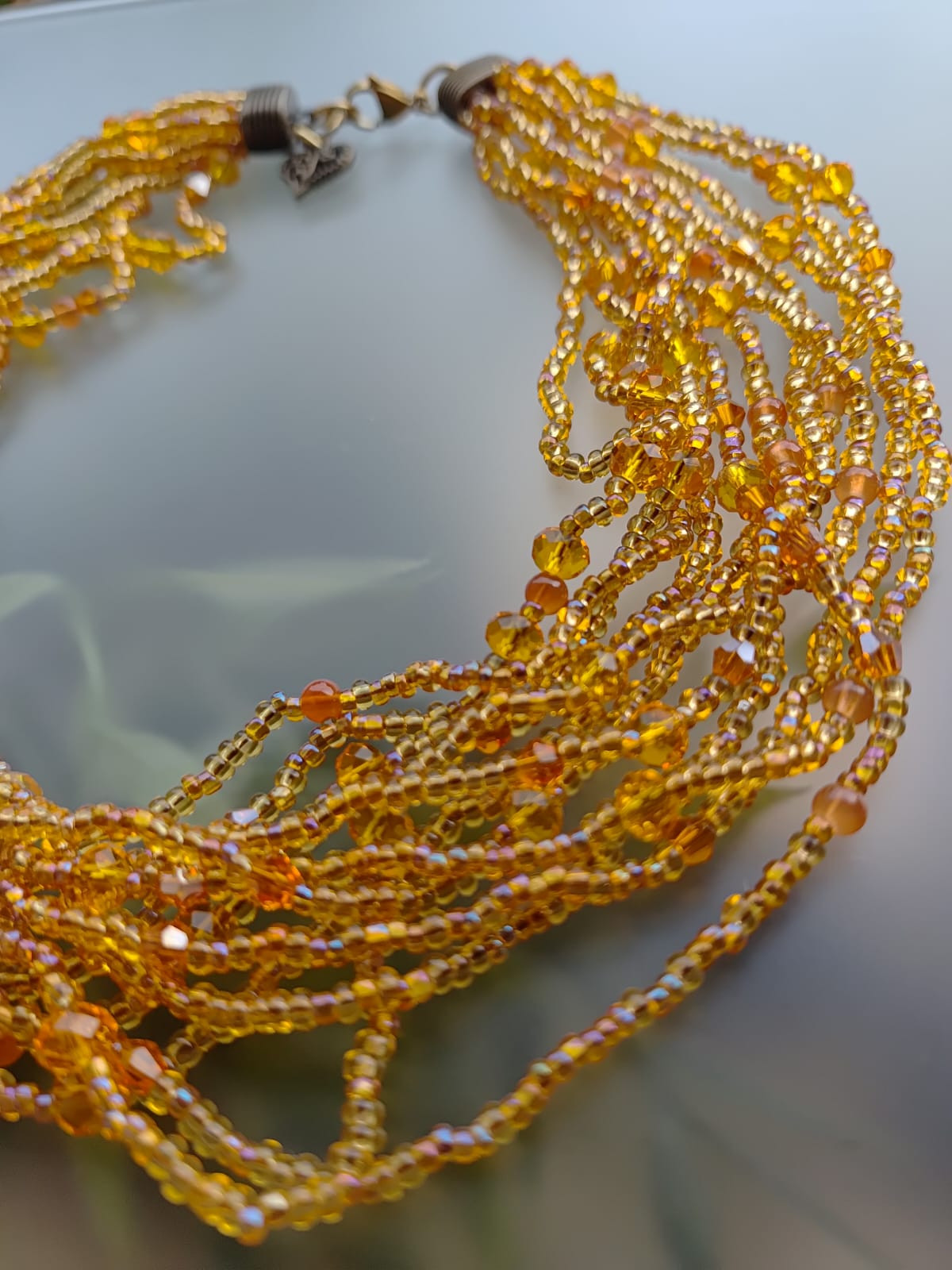 Naszyjnik z kryształków szklanych fasetowanych oponek 7 mm. Koraliki drobne w podobnym bursztynowym kolorze 2 mm, Wykończenie naszyjnika z metalu, końcówki w kolorze brązu i zapięcie ze stali nierdzewnej w kolorze złotym. Objętość 45 cm
