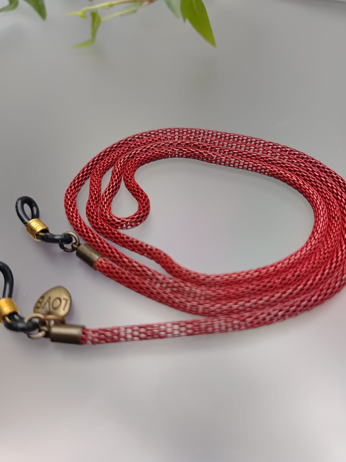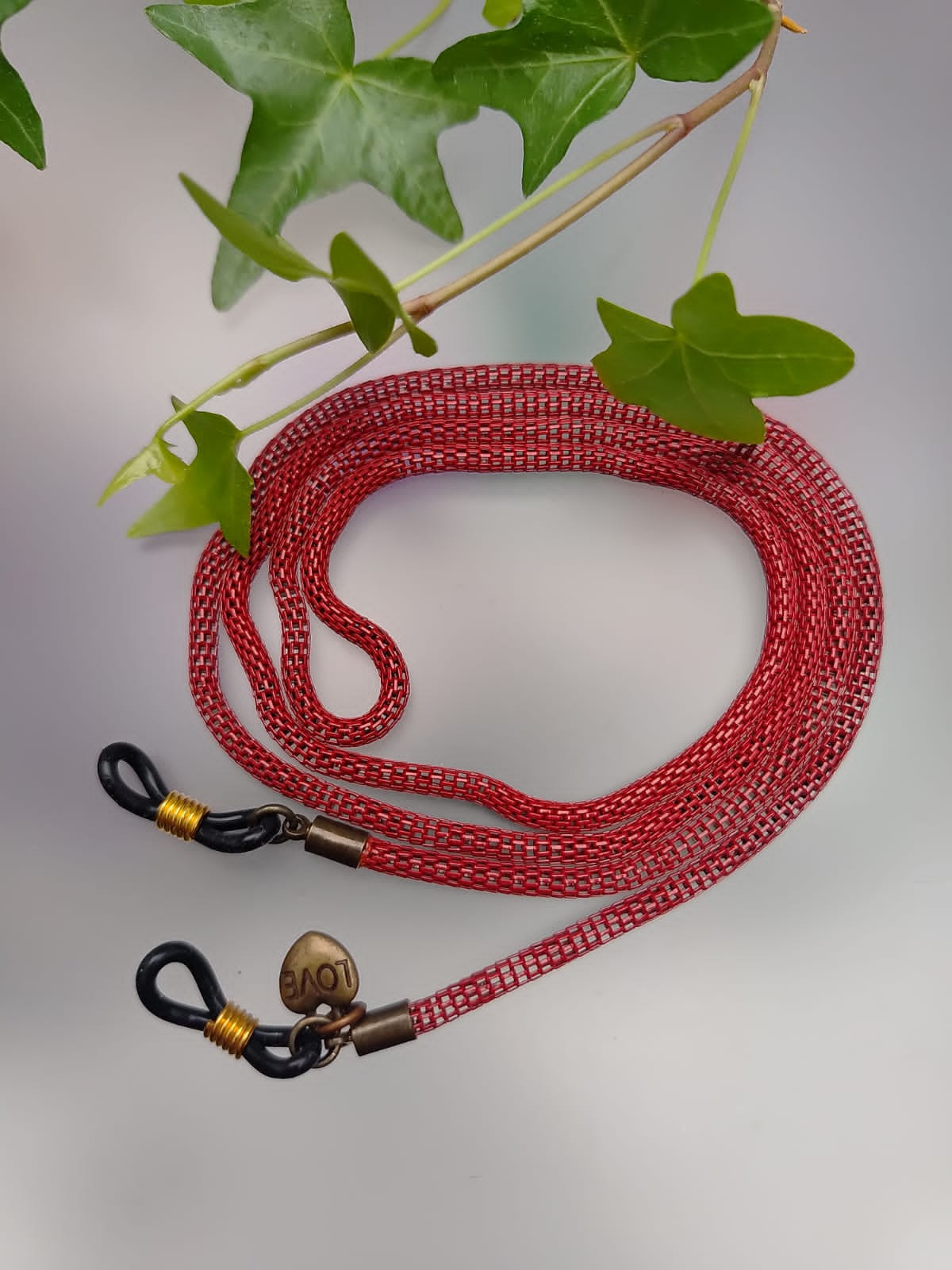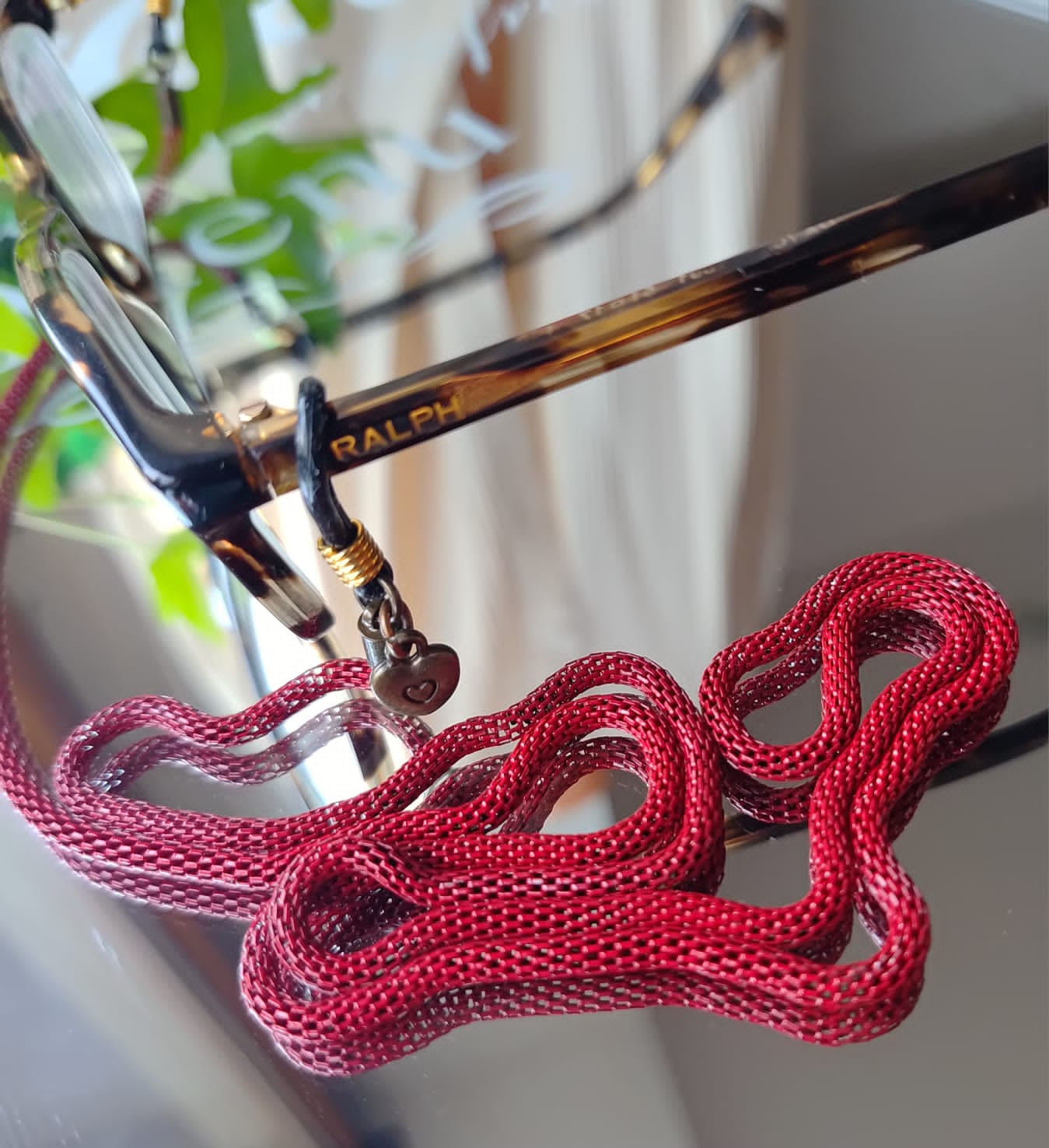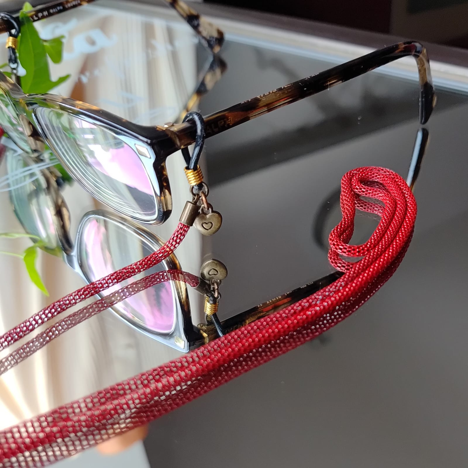 Łańcuszek do okularów czerwony żmijka z malutką ozdobą serduszkiem. Długość 87 cm, gumki zaciskowe silikonowe czarne