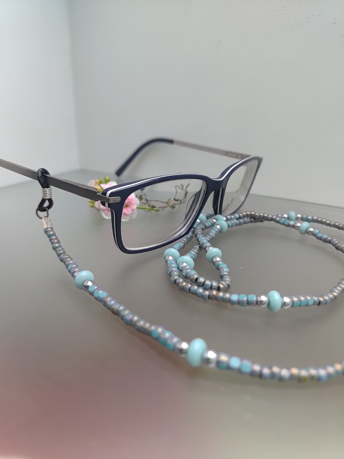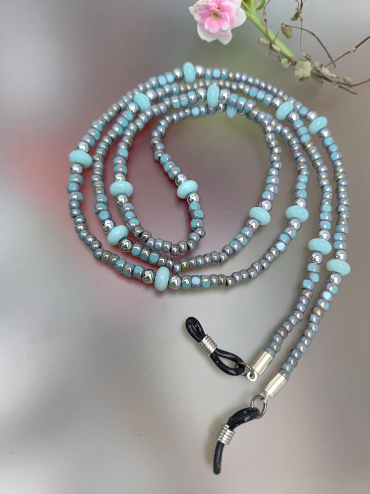 Łańcuszek do okularów ozdobny z koralików. Koraliki oponki niebieskie i mniejsze koraliki różne turkusowe, przekładki kuleczki z hematytu. Długość 87 cm, gumki zaciskowe silikonowe czarne