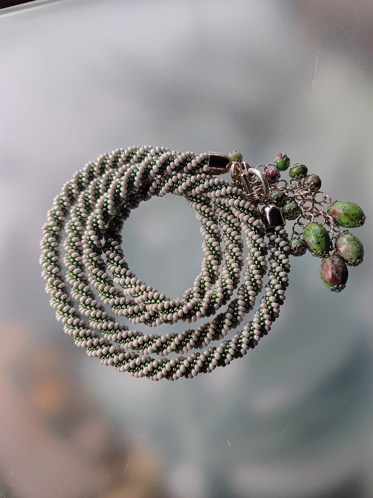 Długi 117 cm lariat lub pasek z zoisytem, elementy metalowe, zoisyt w kolorze zielonym z przebarwieniami fioletu, po odpięciu zawieszki może służyć jako naszyjnik podwójnie oplatający szyje. Bardzo efektowny satynowa zielen z popielem