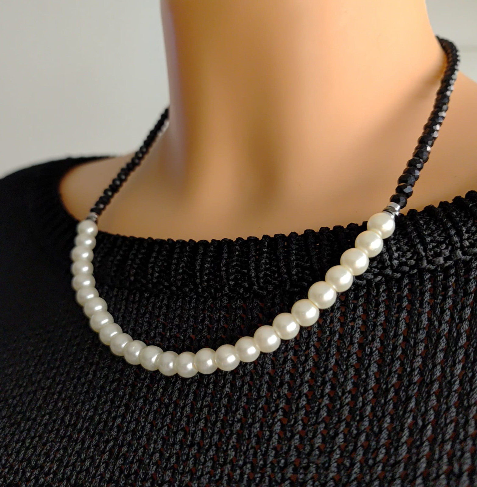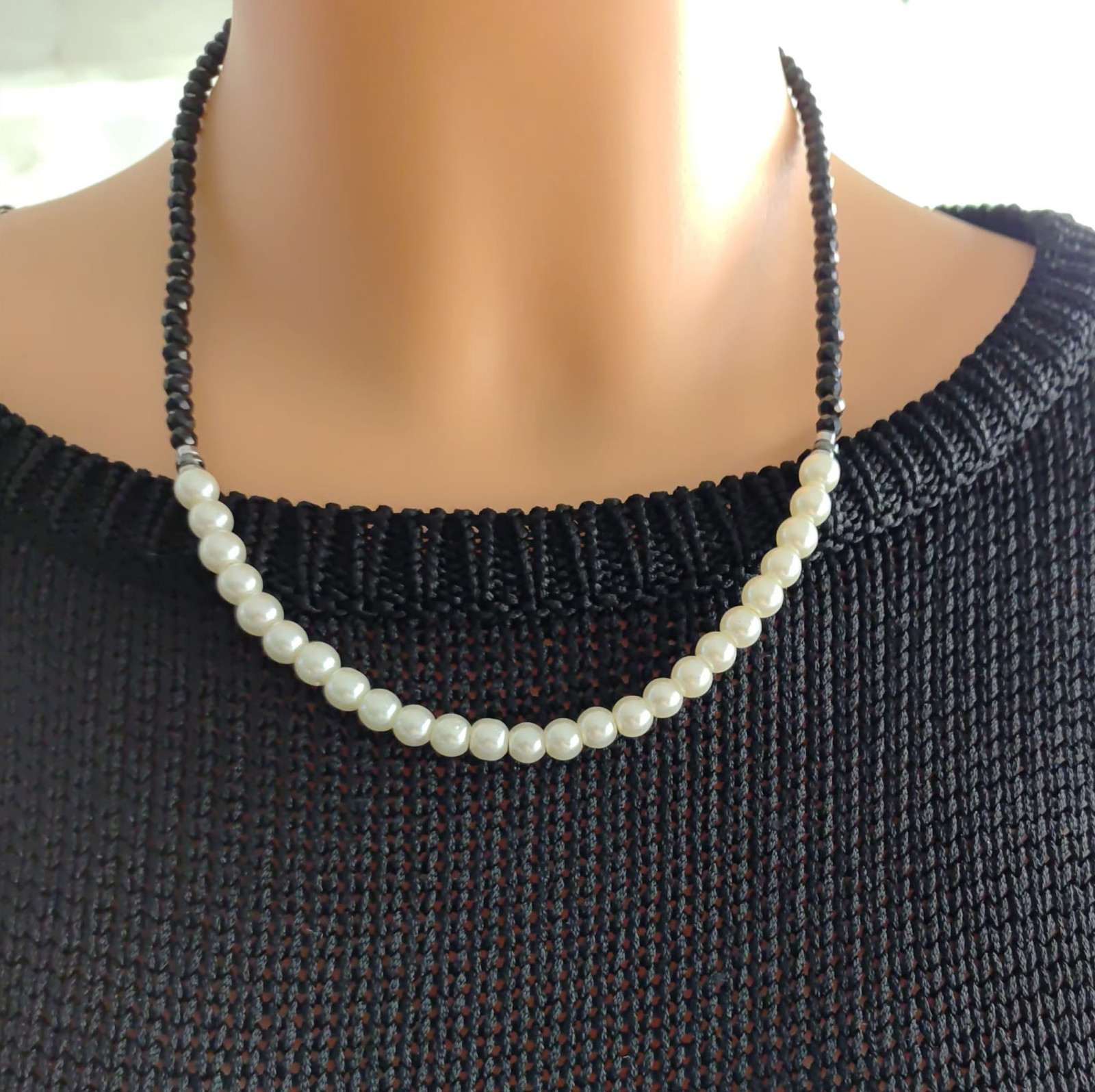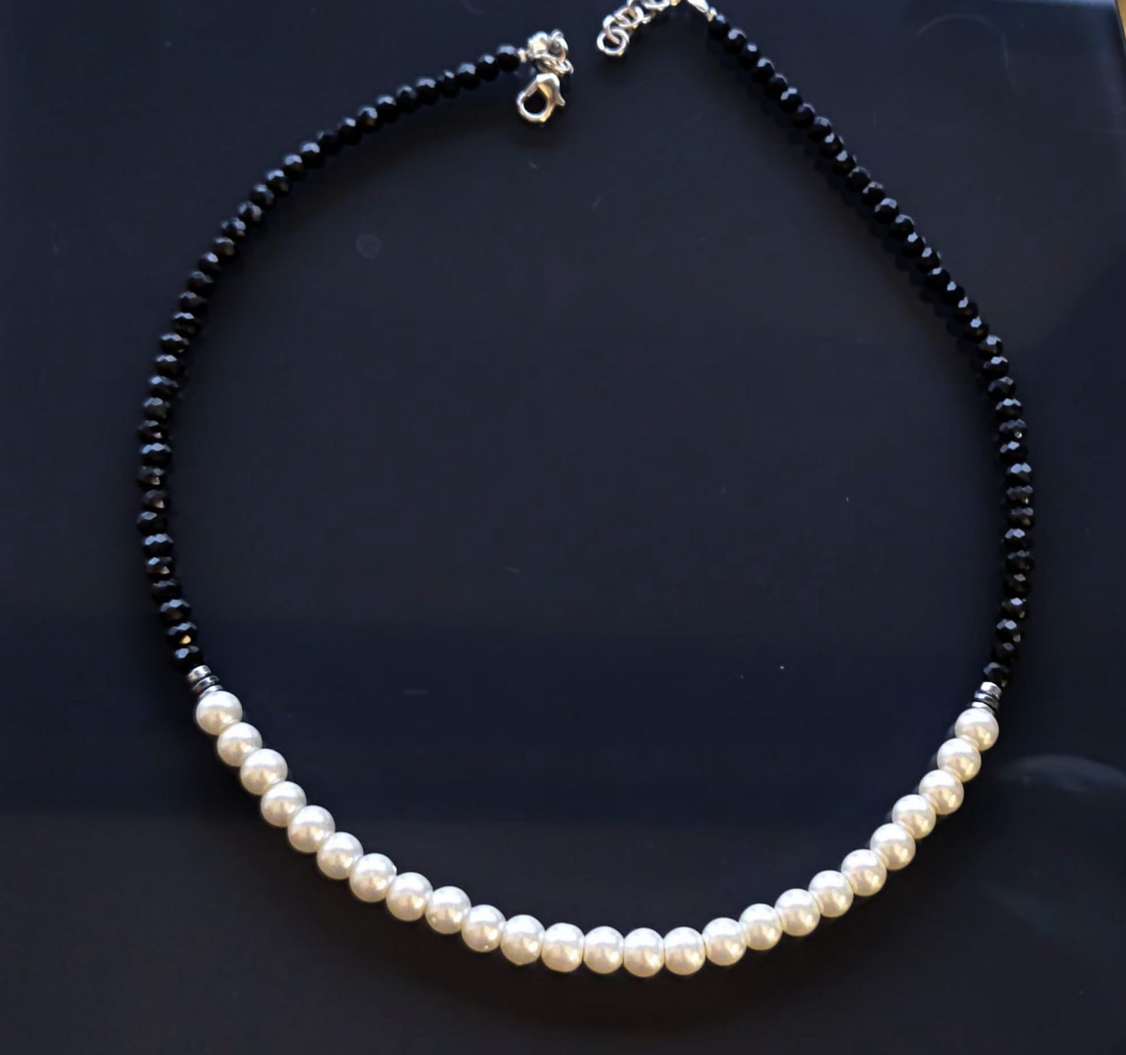 Naszyjnik delikatny, minimalistyczny, perełki szklane białe i kryształki szklane czarne, przekładki z hematytu. Pięknie prezentuje się w każdej stylizacji. Objętość naszyjnika wynosi 45 cm, zapięcie ze stali chirurgicznej
