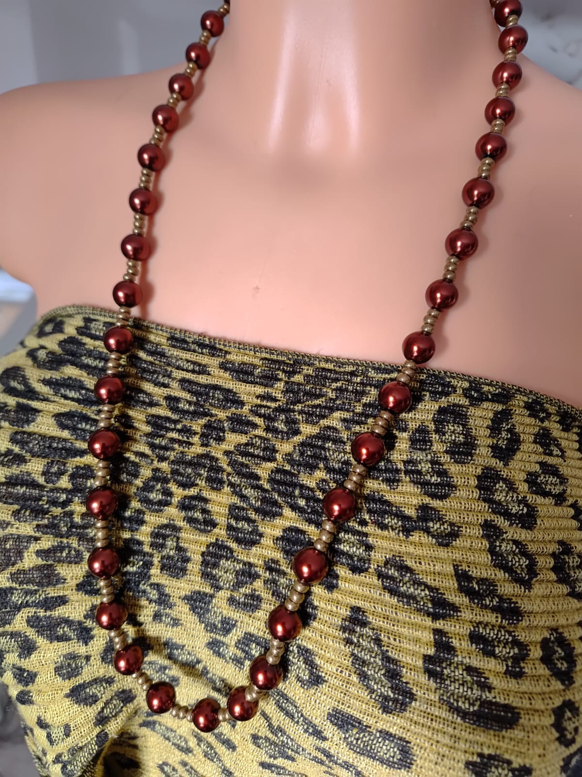 Naszyjnik z pereł szklanych długi 36 cm, bez zapięcia wygodnie zakładane przez głowę zwłaszcza dla osób mających problemy z małymi zapięciami. Korale szklane na sznurku syntetycznym.
