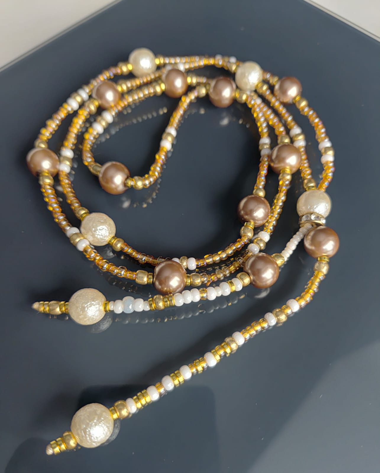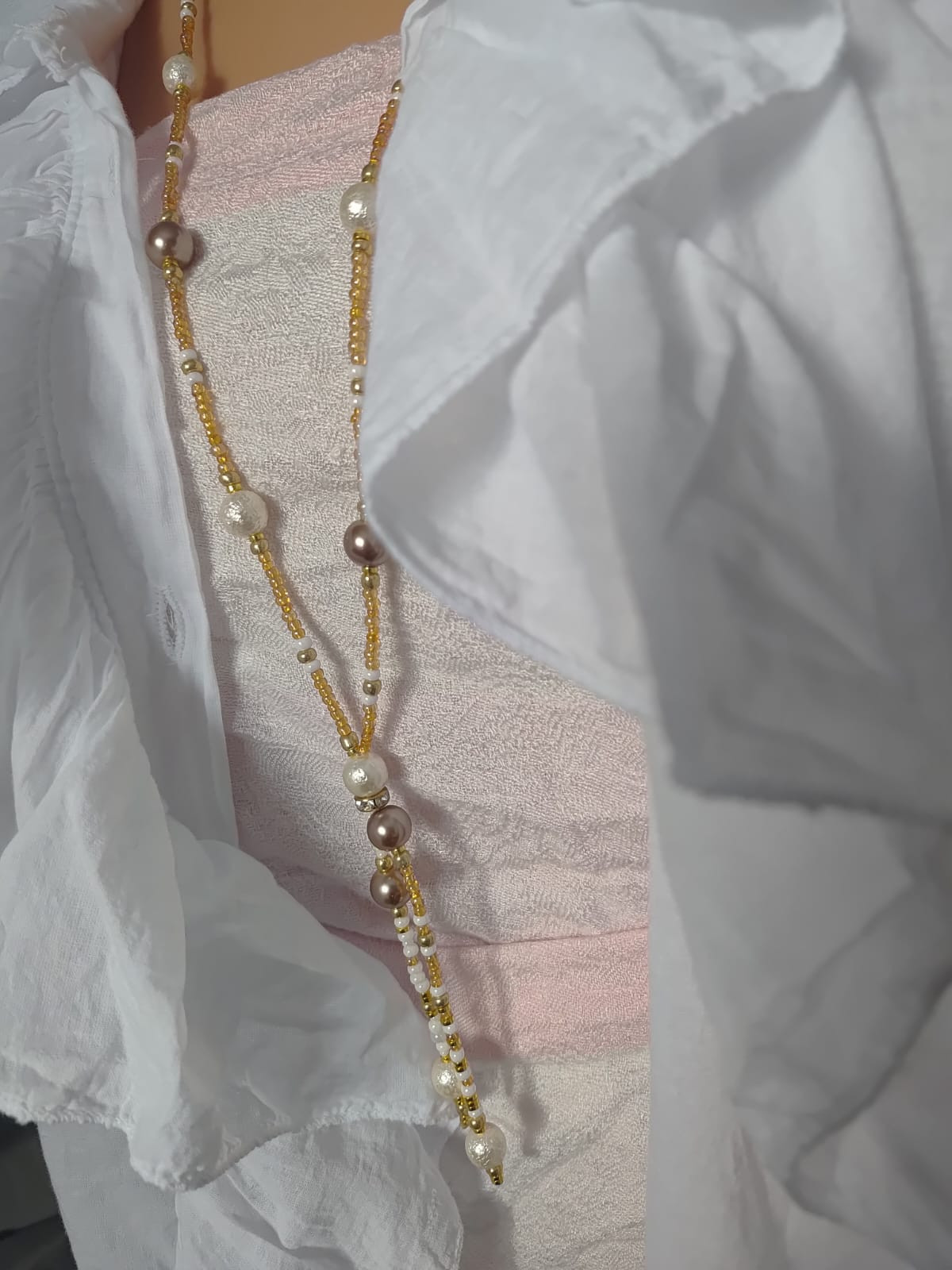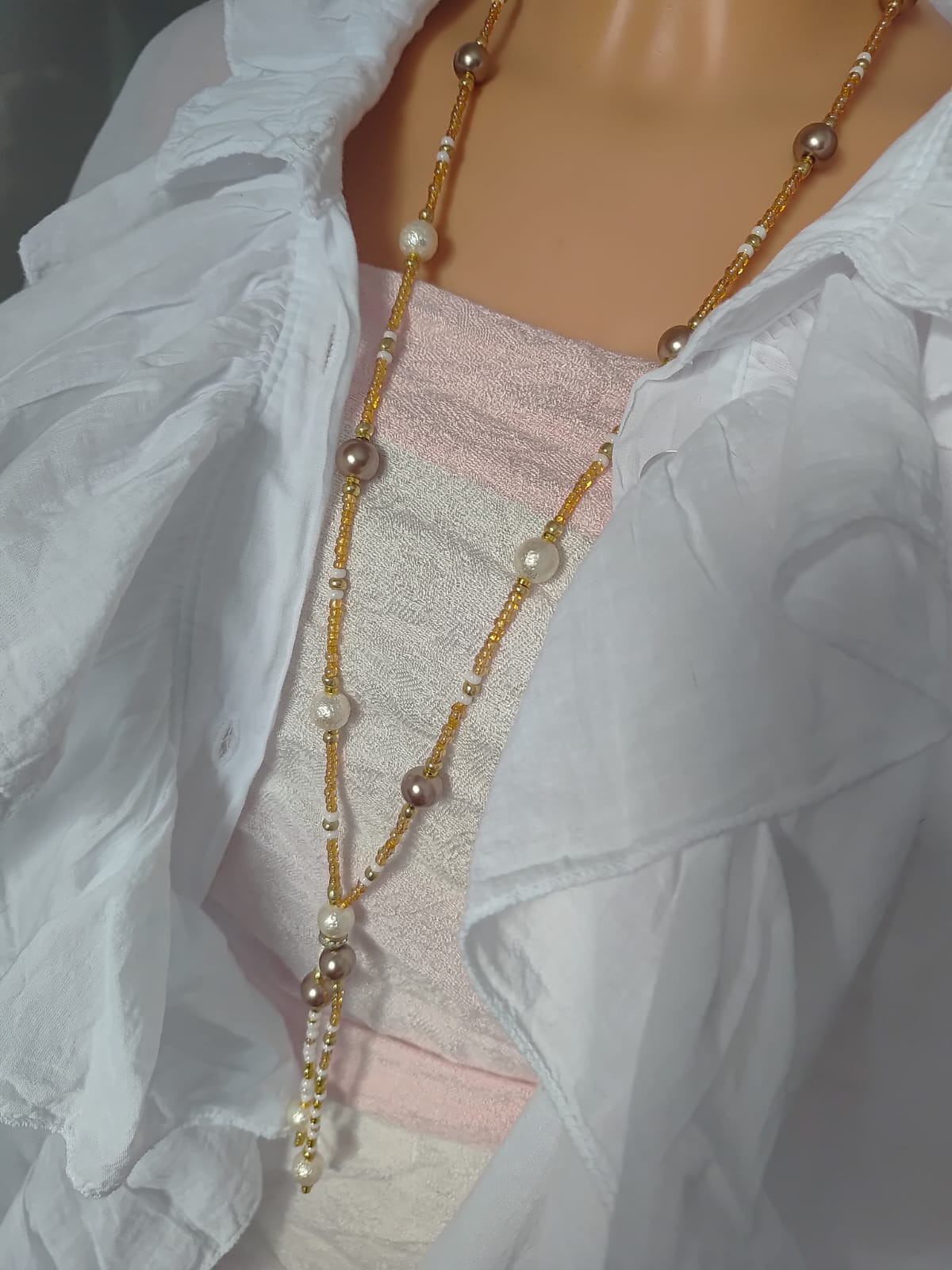 Naszyjnik z pereł szklanych dużych, gniecionych, białych, z najlepszego czeskiego szkła i i innych w kolorze beżowym. Inne koraliki to szkło w kolorze zlotym i białym perłowym, drobne 3 mm Naszyjnik dlugi, wygodnie zakładany przez głowę bez zapięcia. Wykończone jest chwościkiem i malutka przekładką ze szklanymi cyrkoniami.