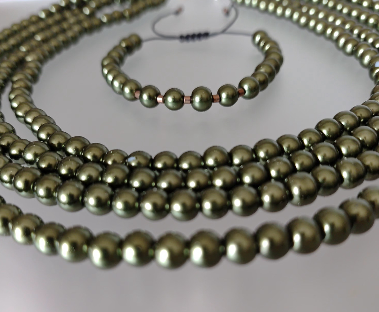 Naszyjnik z korali szklanych kulek perłowych zielonych 6 mm i przekladek hematytu w kolorze miedzi, komplet naszyjnik, bransoletka, Elegancka biżuteria, wieczorowa. Ponadczasowa elegancja przełamana ponadczasowym stylem wiazania bransoletek. Makramowe zapięcie bransoletki pozwalajace na dowolną regulację. Objetość naszyjnika 44 cm, objętość bransoletki 15-25 cm