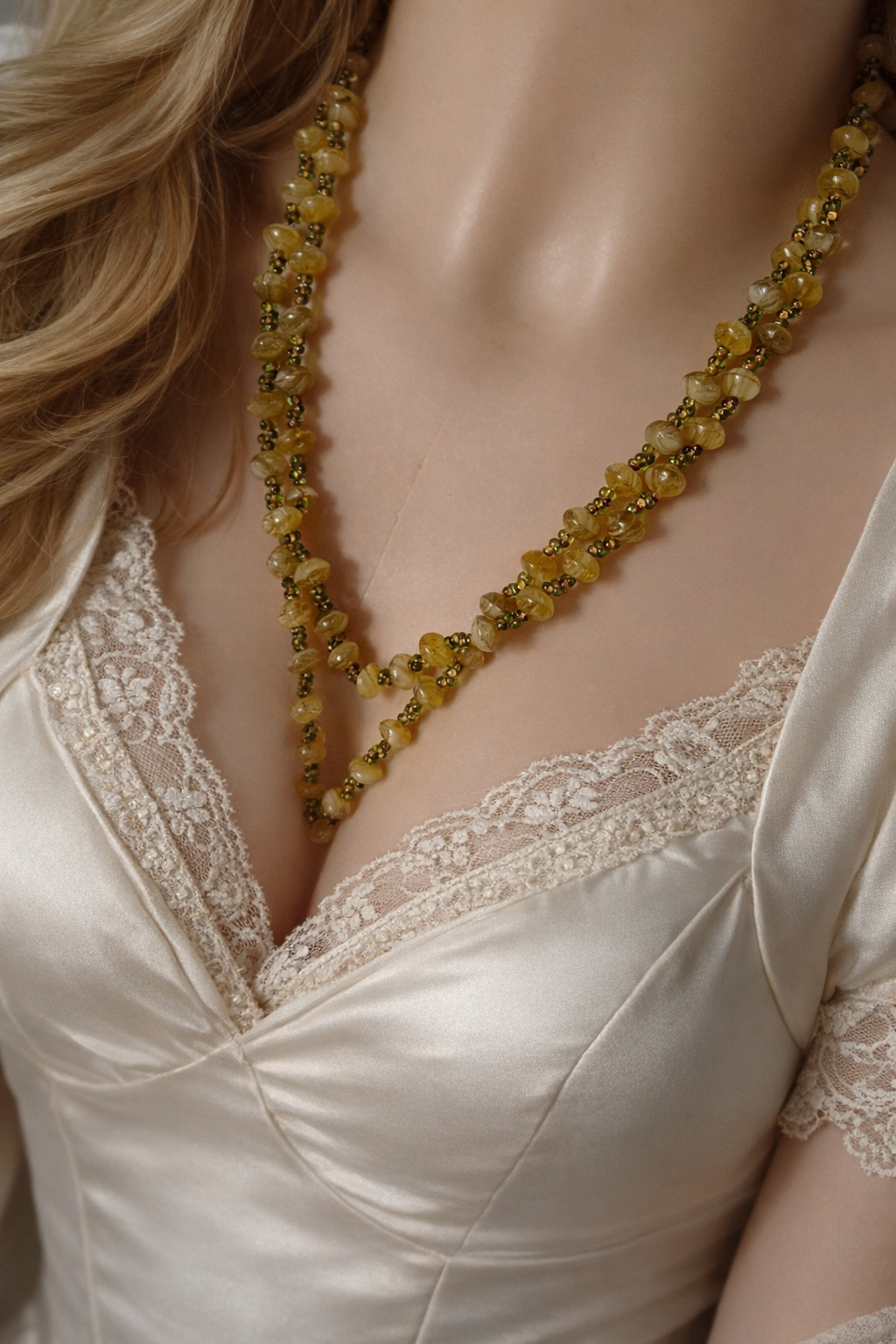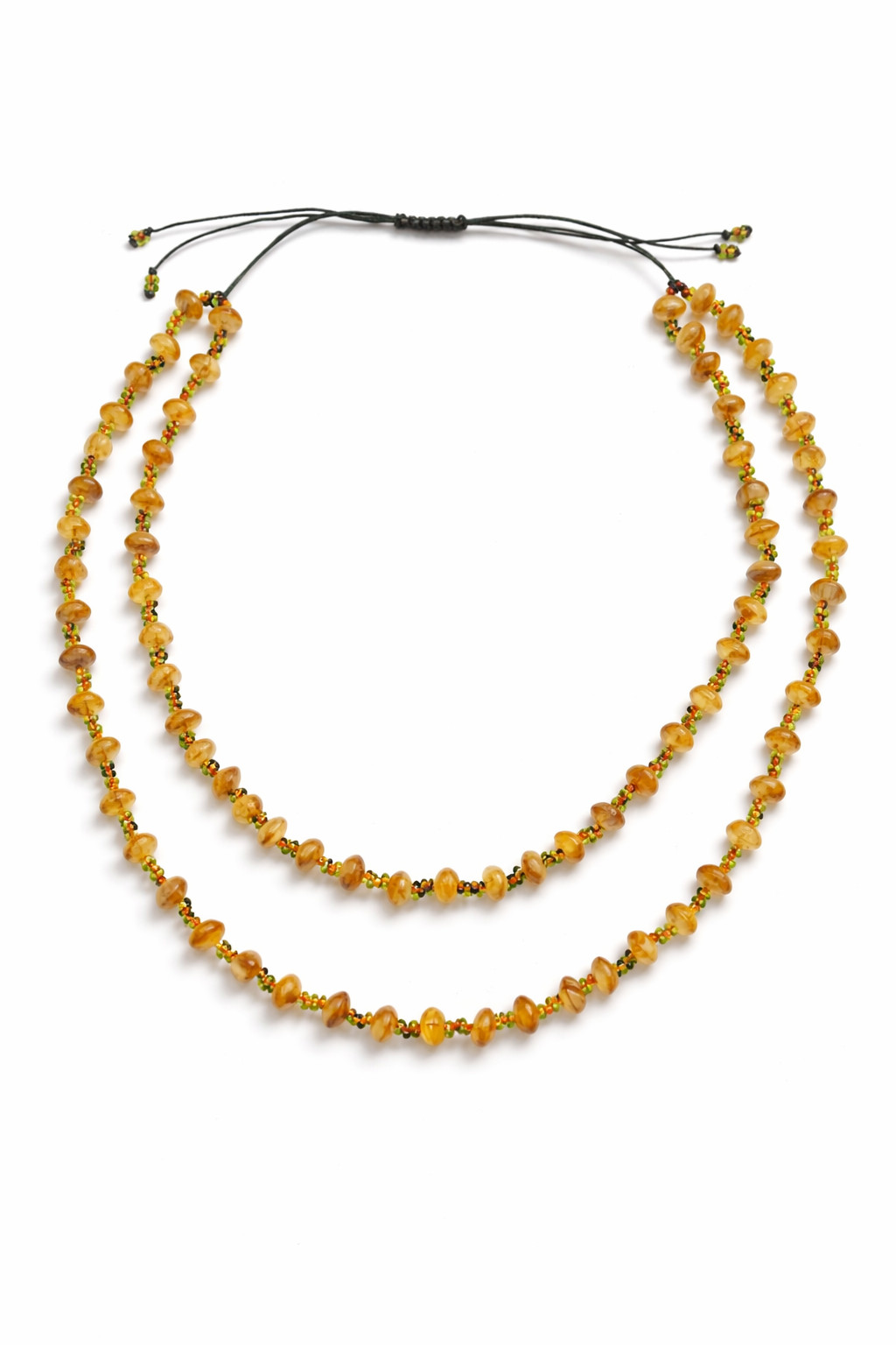 Naszyjnik zrobiony na dwóch sznurkach różnej długości. Korale szklane spłaszczone kulki o rozmiarze 5x8 mm, koraliki w kolorze bursztynowym. Małe koraliki użyte jako przekładki są dwukolorowe: zielone szkło transparentne z pomarańczowym środkiem ożywiają naszyjnik. Aby całość była spójna użyłam zielonego sznurka syntetycznego. Korale bez zapiecia, ale ścieg makramowy sznurka pozwala na regulację długości od 27 do 38 cm
