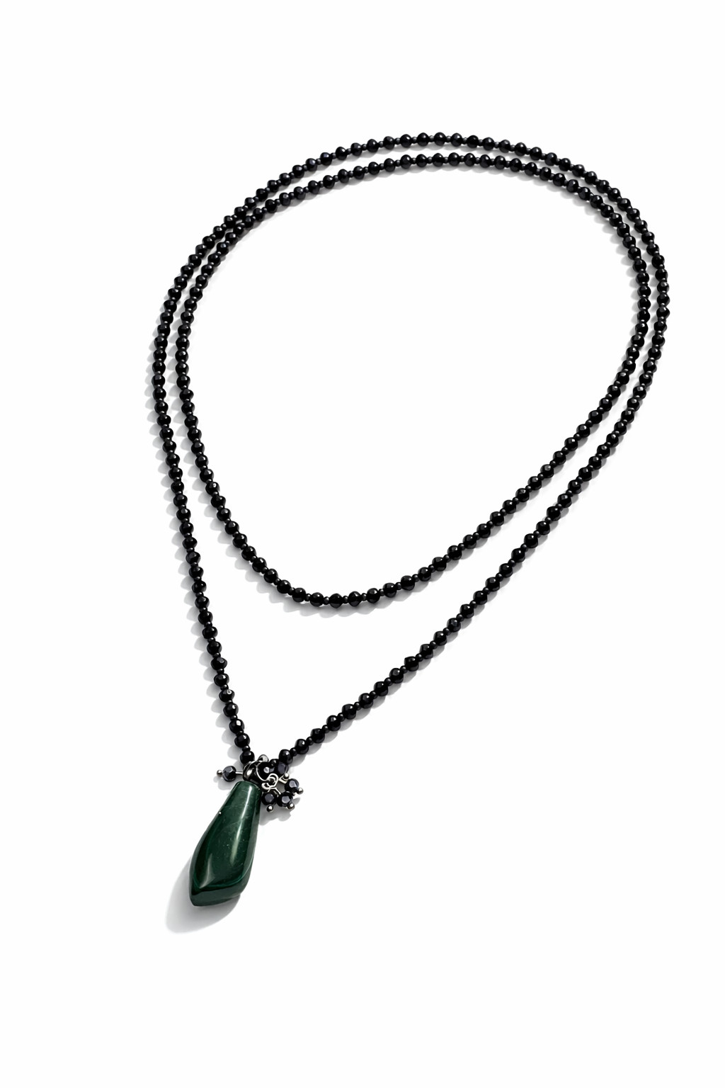 To elegancki sznur składający się z czarnych koralików szklanych oponek fasetowanych i wisiorka z bryłki malachitu. Razem z bryłką zawieszone są czarne koraliki. Długość sznura wynosi 50 cm plus 3 cm wisiorek. Sznur można owinąć dwukrotnie lub związać węzeł.