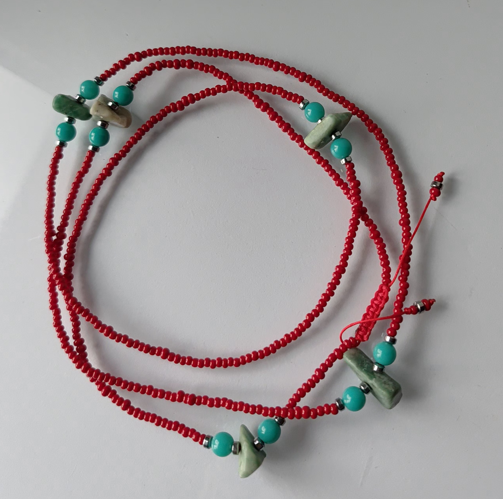 Naszyjnik na sznurku koraliki czerwone i turkusowe, Minerał w kolorze zielonego turkusu i przekladki z hematytu. 2x46 cm, sprawdzi sie również jako bransoletka.
