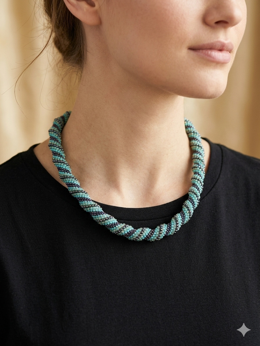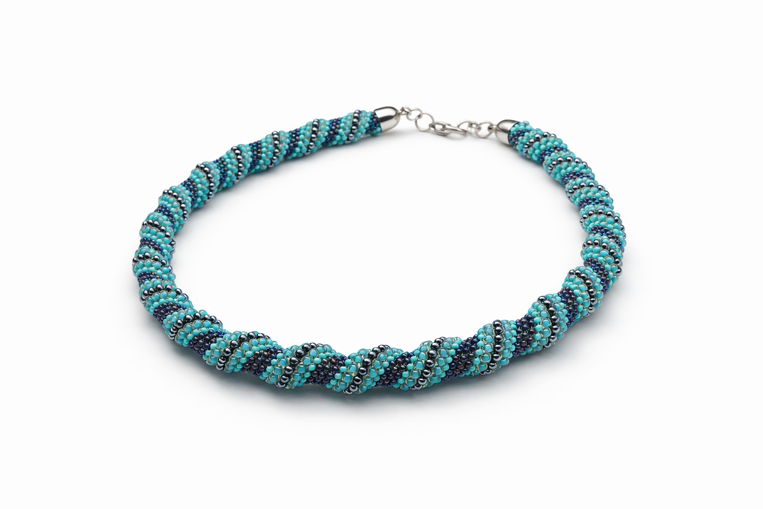 Elegancki naszyjnik wykonany pracochłonną techniką koralikową, tworzący efektowną, trójwymiarową spiralę. Połączenie matowego turkusu z lśniącymi, ciemnymi koralikami o metalicznym połysku nadaje biżuterii nowoczesnego, a zarazem luksusowego charakteru. Stalowe wykończenie. Wygodne duże zapięcie. Długość sznura całkowita w linii prostej od zapięcia do zapięcia wynosi 40 cm