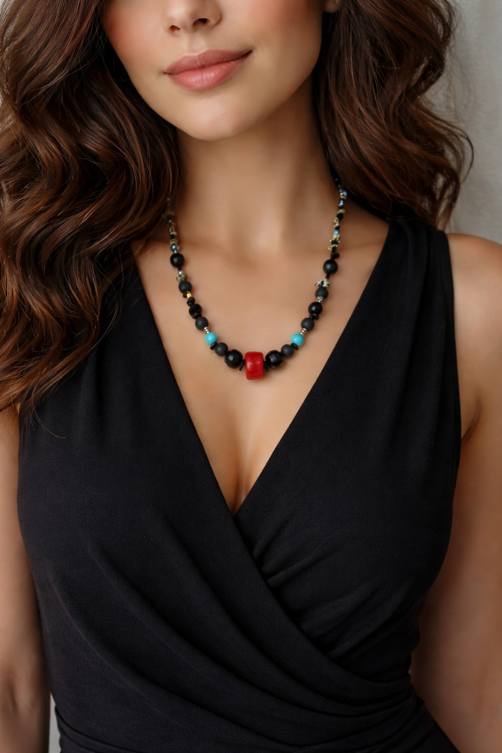 Naszyjnik składa się z eleganckich, czarnych korali, które tworzą główną część ozdoby. Wśród szklanych korali fasetowanych znajdują się kuleczki lawy wulkanicznej i polerowane kamyczki grysu zwanego dalmatyńczykiem. W centralnym punkcie znajduje się piękna bryłka czerwonego korala, która przyciąga wzrok. Dodatkowo, po bokach znajdują się dwie malutkie kuleczki koralików, które dodają całości subtelnego kontrastu i koloru. Objętość naszyjnika wynosi 53-55 cm