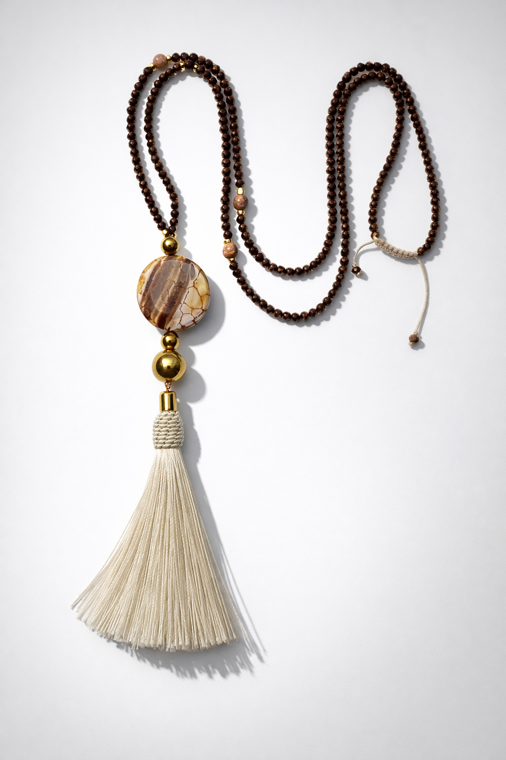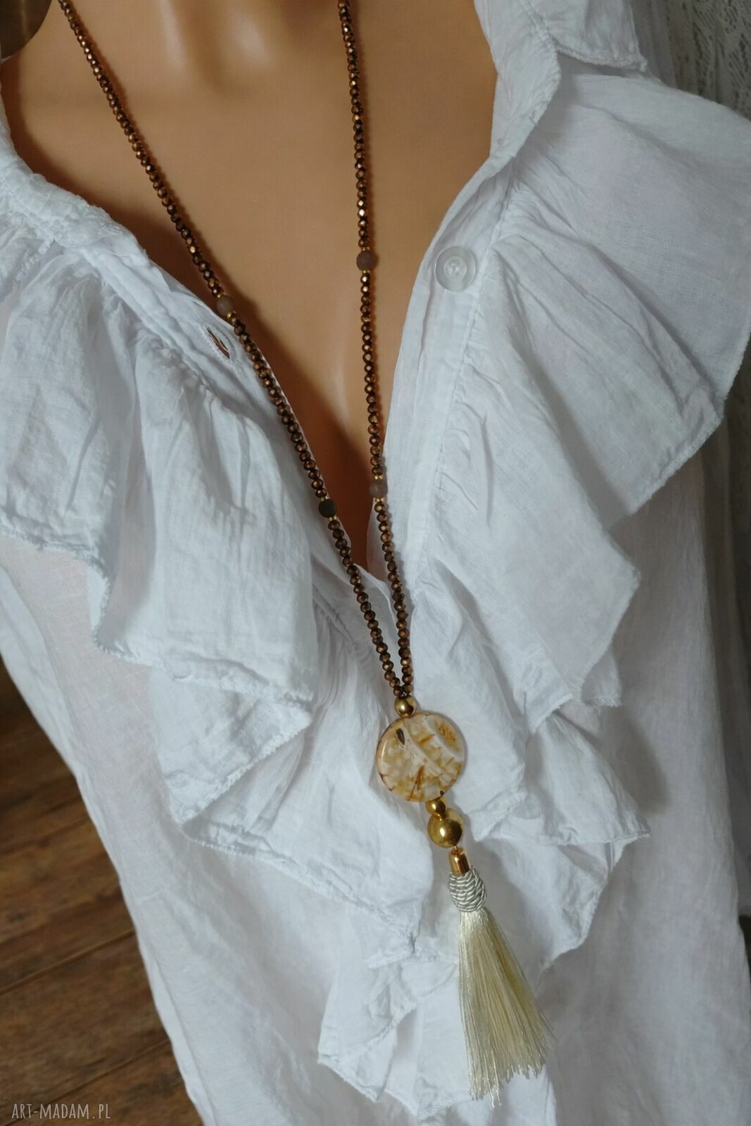 To biżuteria stworzona dla kobiet, które cenią sobie styl boho, autentyczność i niebanalne dodatki. Naszyjnik składa się z dwóch kunsztownie wykonanych sznurów koralików, co tworzy efekt bogatej, a jednocześnie lekkiej kompozycji. Głównym punktem jest owalny medalion w odcieniu szałwiowej zieleni, ozdobiony subtelnym tłoczeniem. Połączenie drobnych, zielonych koralików z ciemniejszymi, plecionymi elementami sprawia, że naszyjnik świetnie komponuje się zarówno z jasnymi, lnianymi ubraniami, jak i ciemniejszymi stylizacjami. Wykończenie z ozdobnymi frędzlami nadaje całości swobodnego, etnicznego charakteru. Długość naszyjnika z frędzlami 55 centymetrów. Każdy sznur można nosić oddzielnie.