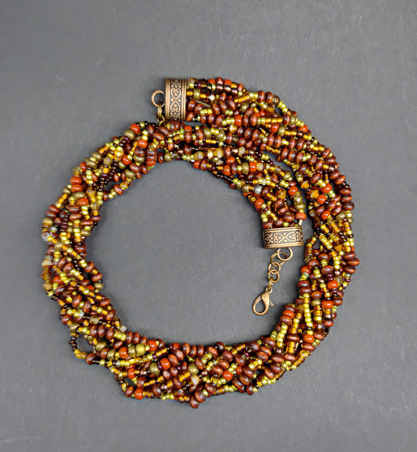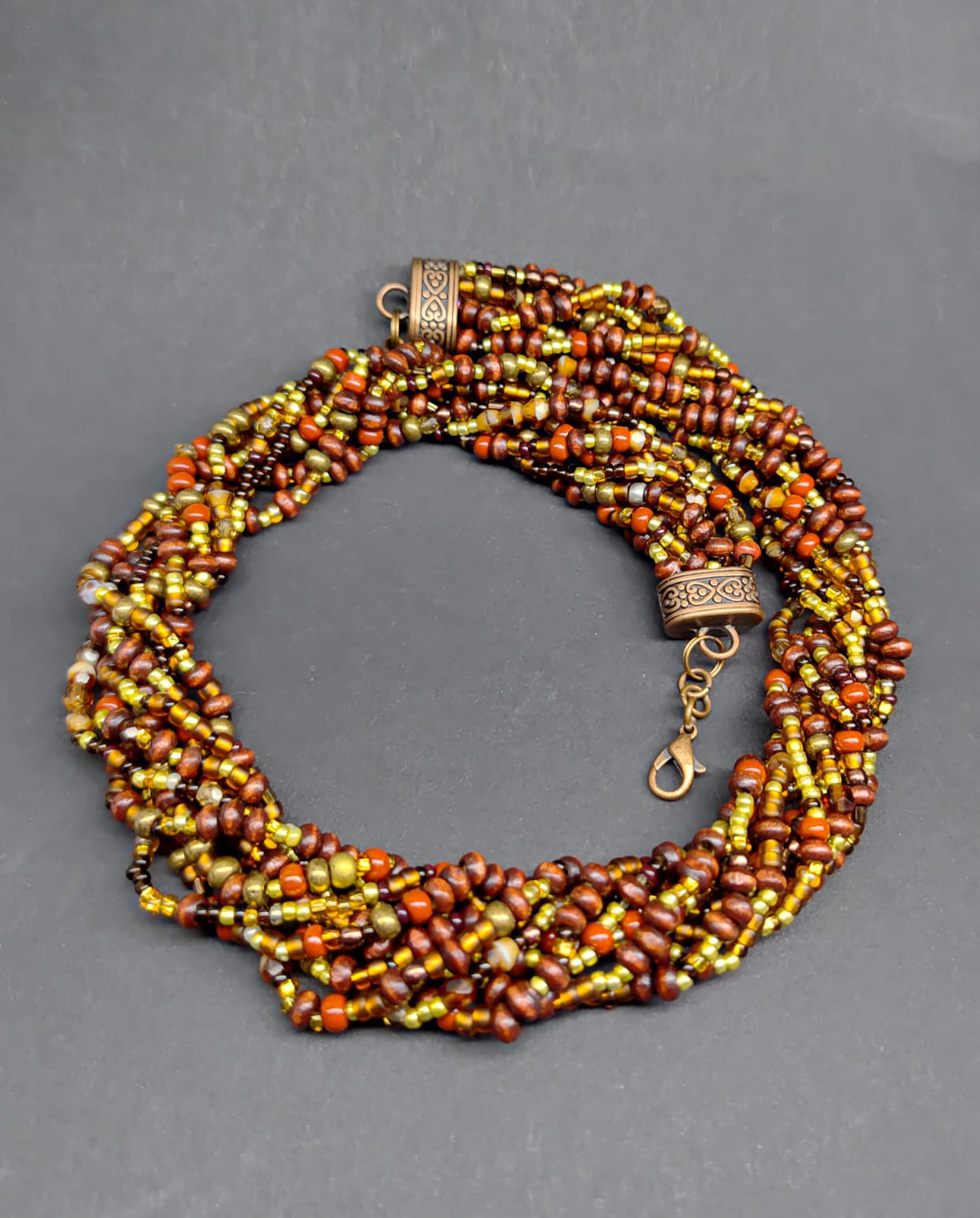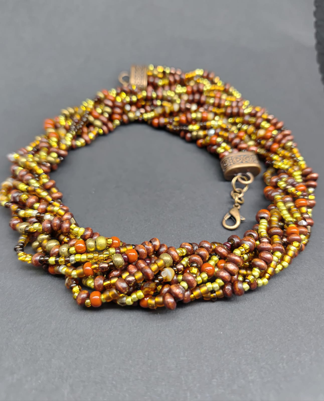 Delikatny i lekki naszyjnik w kolorach złota i brązu. Korale szklane drobne i koraliki drewniane 4 mm. Naszyjnik ma objętość 45-47 cm, wykończene metalowe w kolorze miedzi.