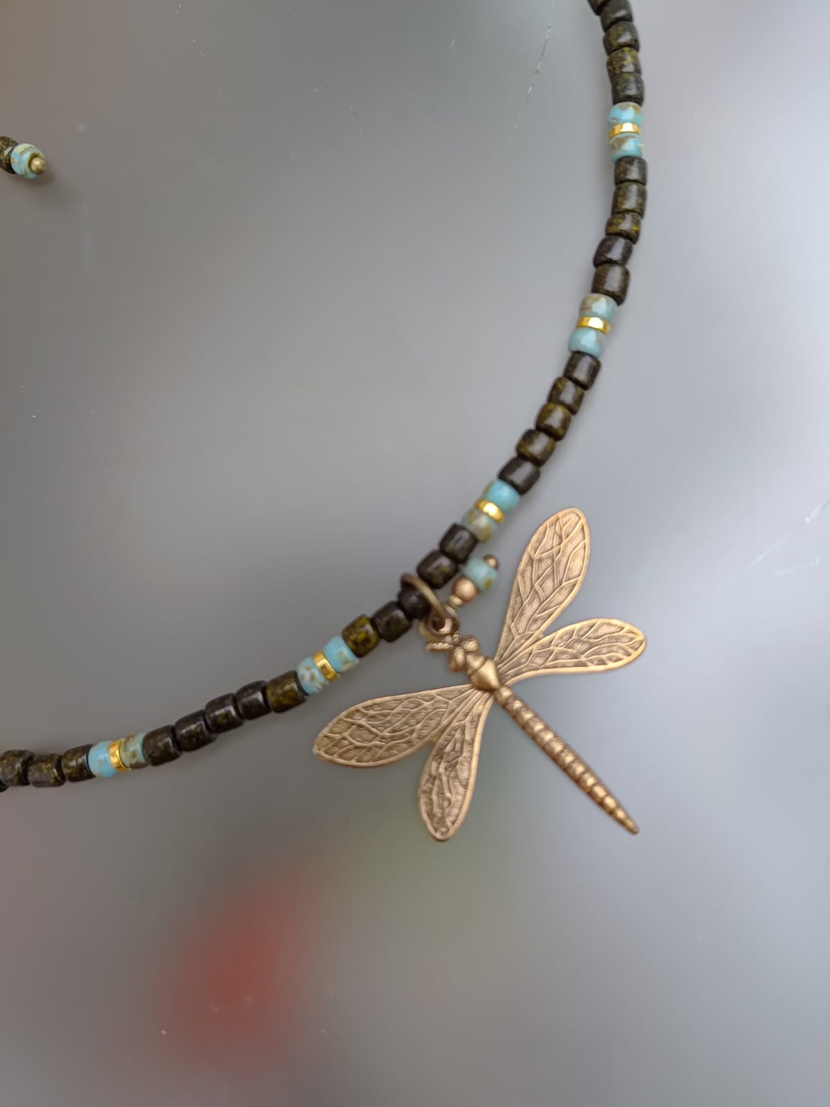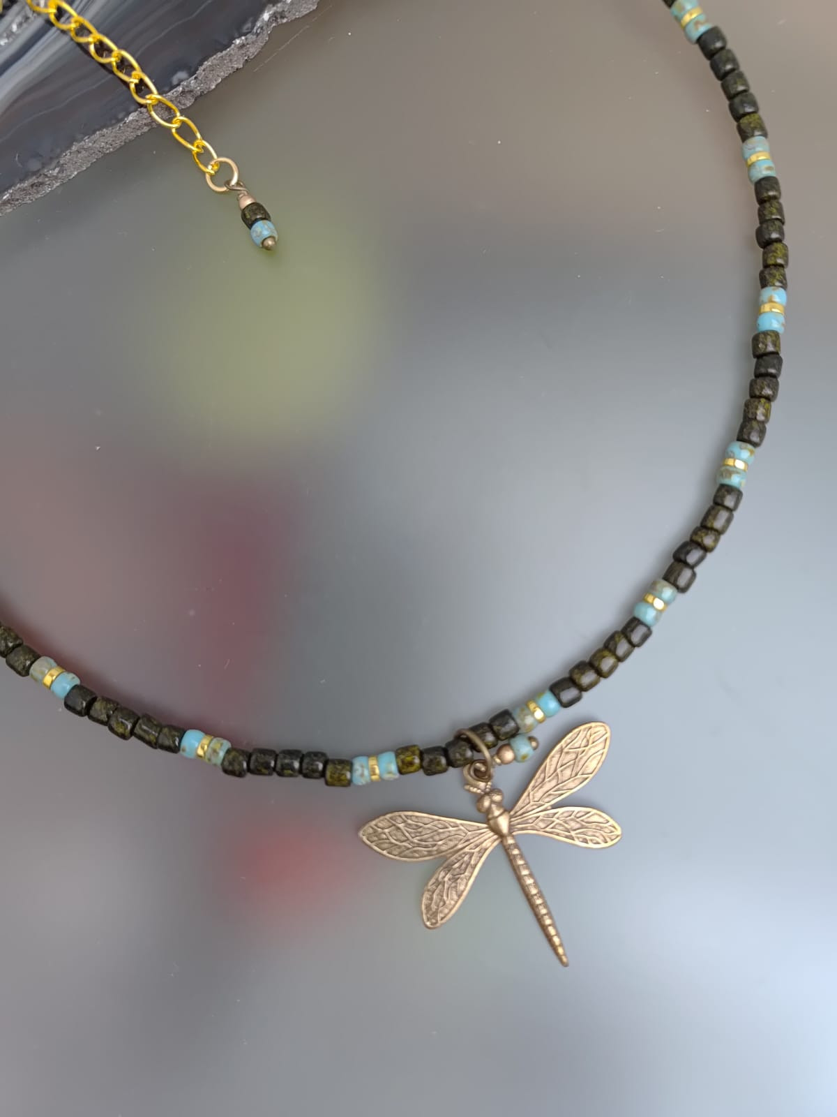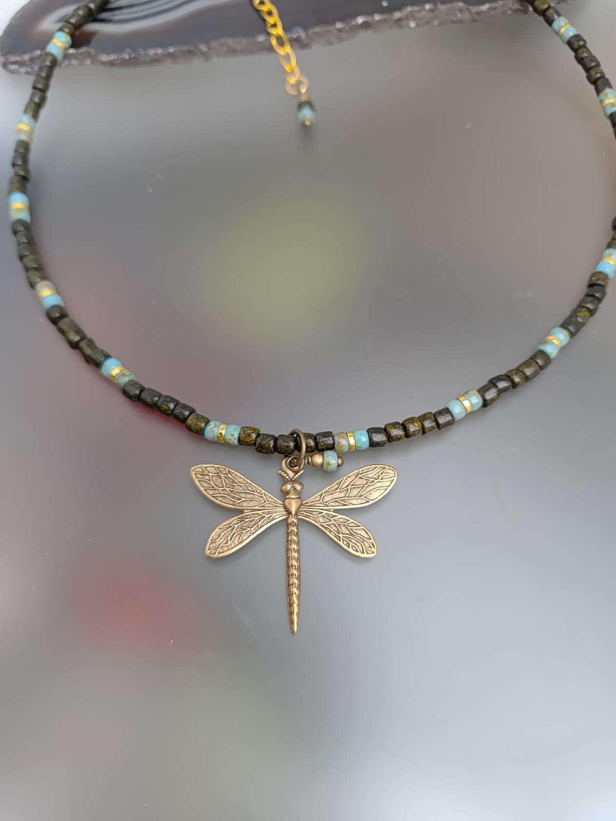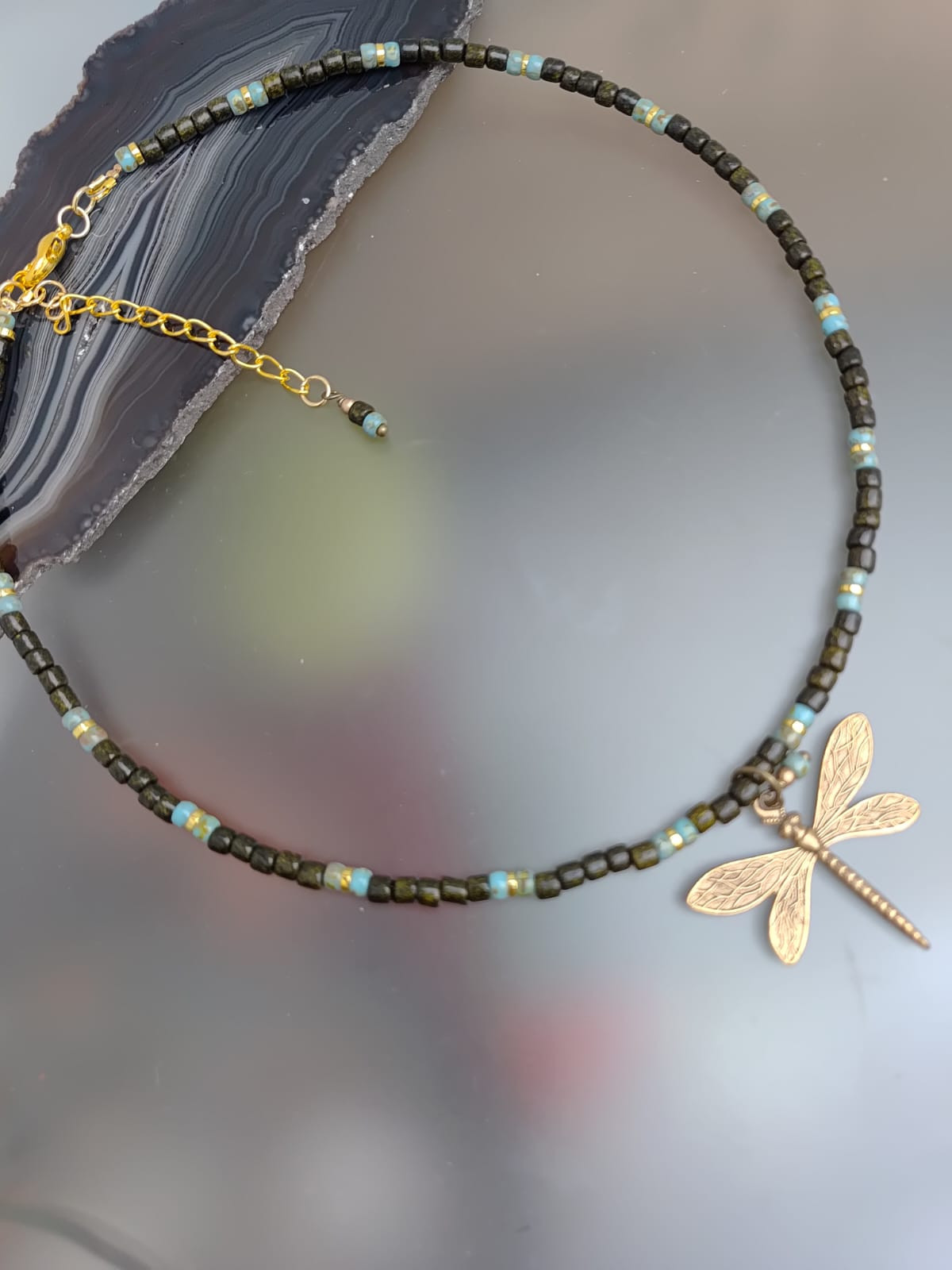 Naszyjnik z koralików szklanych zielony czarne i turkusowy trawertyn z przekładkami z hematytu w kolorze złotym. Wisiorek ważka 3 cm, mosiężna wytłoczka z koralikiem. Objętość 41-48 cm, zapięcie ze stali nierdzewnej.