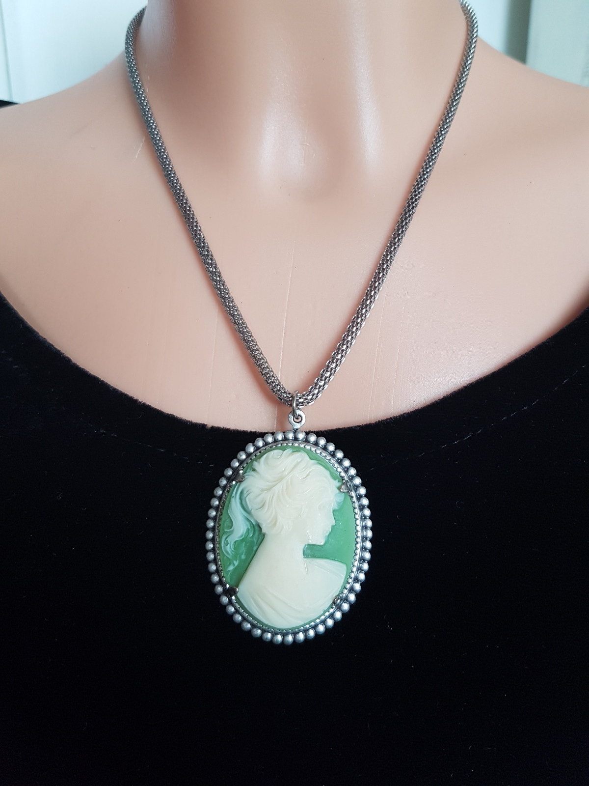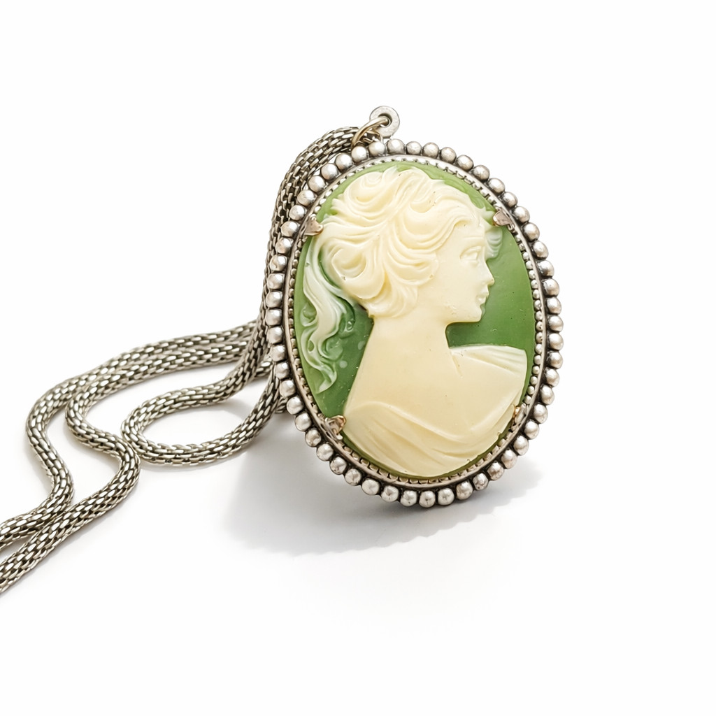 Naszyjnik z zieloną kameą - Styl Vintage - Srebrzysty Medalion