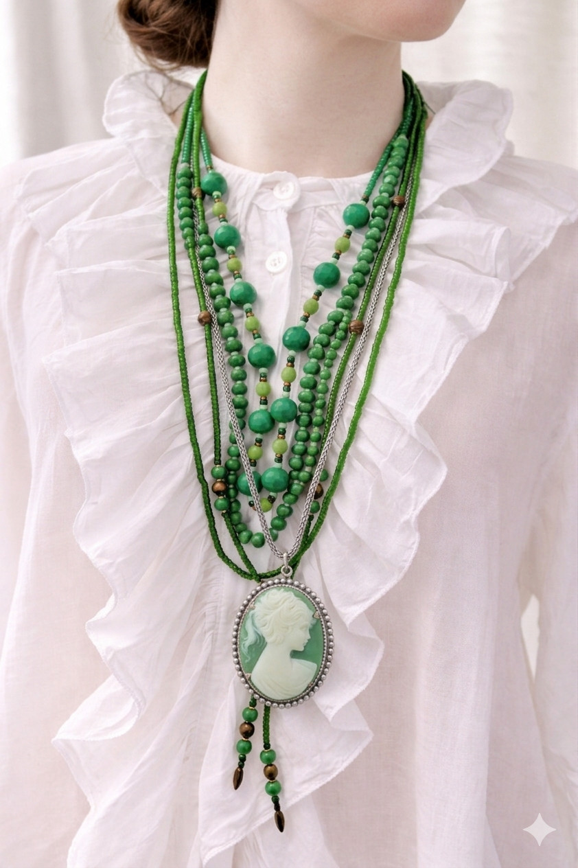 Połączenie wielowarstwowych, zielonych koralików z klasyczną kameą tworzy spójną i efektowną kompozycję, w której różne odcienie zieleni idealnie się uzupełniają. Elementy te nie stanowią kompletu sprzedażowego - klasyczną kameę oraz zielone sznury korali można nabyć jako oddzielne produkty. Prezentowane zdjęcie stanowi jedynie wizualizację, mającą na celu pokazanie potencjalnego sposobu łączenia obu produktów. Ostatnie zdjecie pogladowe jak dobrze naszyjnik komponuje sie z innymi koralami.