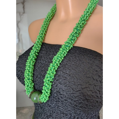 Naszyjnik wypleciony ręcznie w formie sznura z koralików, kula duża ceramiczna 2,5 cm z metalowymi młotkowanymi przekładkami. Sznur ma grubość 1,8 cm , długość całkowita sznura od zapięcia do zapięcia wynosi 77 cm , Biżuteria oryginalna, drugi taki egzemplarz nie powstanie. Jest efektowny i duży. Pięknie prezentuje się do letniej białej sukienki. Soczysta zieleń doskonale komponuje się z każdą kwiecista kreacja , ale równie dobrze wygląda na czarnym swetrze. Daje wiele możliwości, niebanalna, pomysłowa.