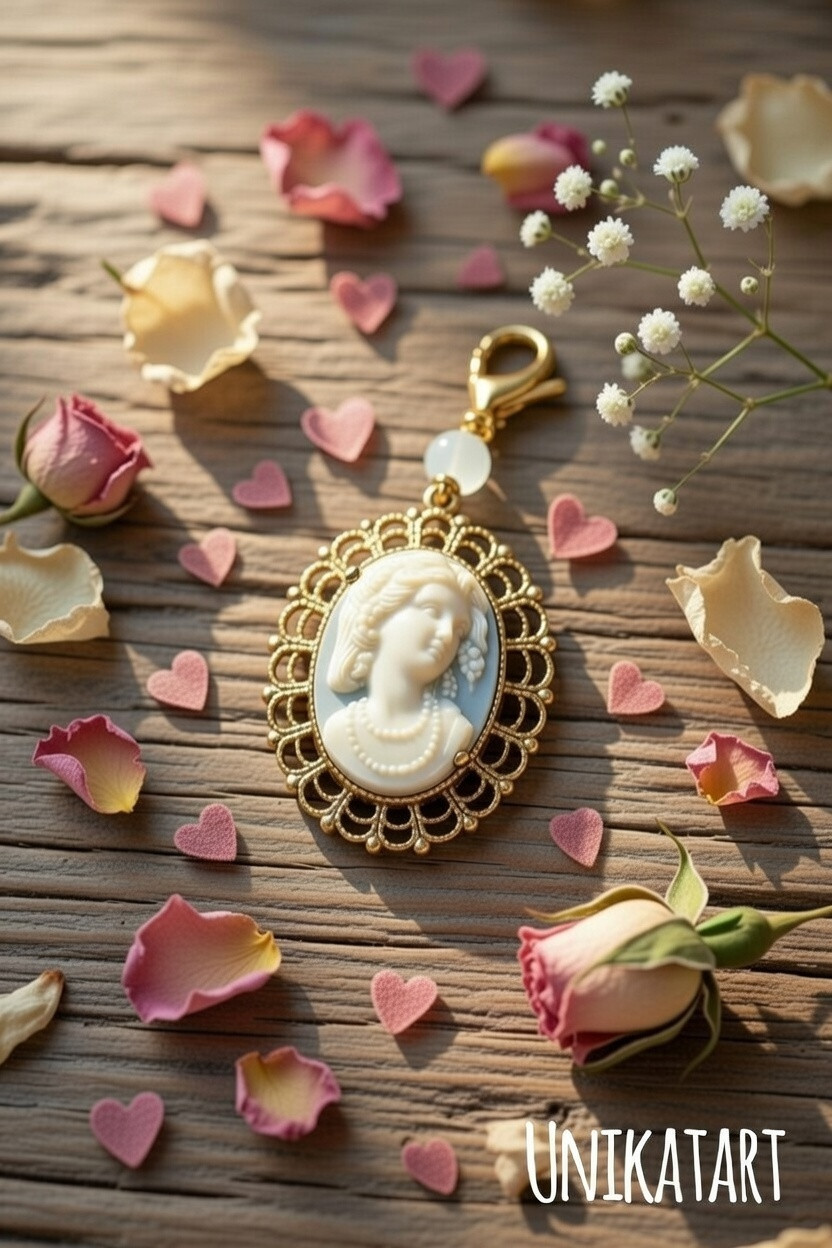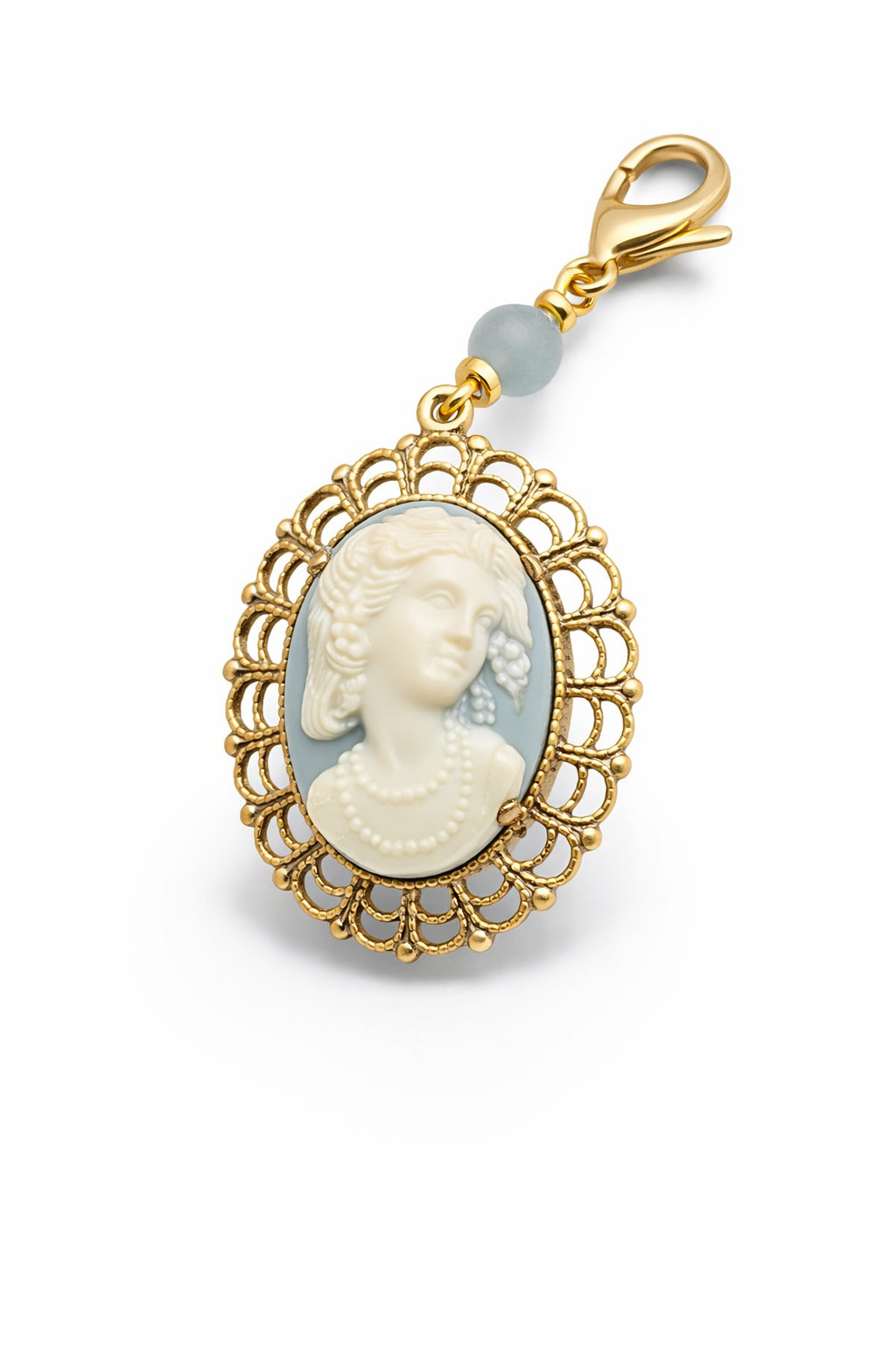Camea oprawiona w mosiężna koronkową oprawę, z kuleczką jadeitu niebieskiego i złotego hematytu. Zapięcie ze stali nierdzewnej. Wisiorek można zapiąć jako breloczek, można zawiesić na łańcuszku lub na koralach, będzie stanowił piękny, biżuteryjny dodatek. Z zapięciem 6,5 cm