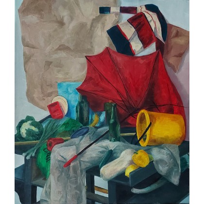 Kolorowa martwa natura z czerwonym połamanym parasolem, żółtym wiadrem i pasiastą koszulką.