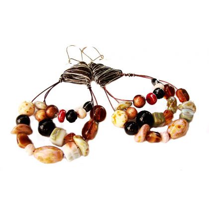 Kolczyki łezki wykonane z opalizujących szklanych koralików,koralików drewnianych i perełek na lince jubilerskiej. Całość ozdobnie oplatana brązowym i posrebrzanym drucikiem. Długość całkowita kolczyka wynosi 8 cm a bigle tak jak we wszystkich moich pracach wykonane są ze srebra próby 930.