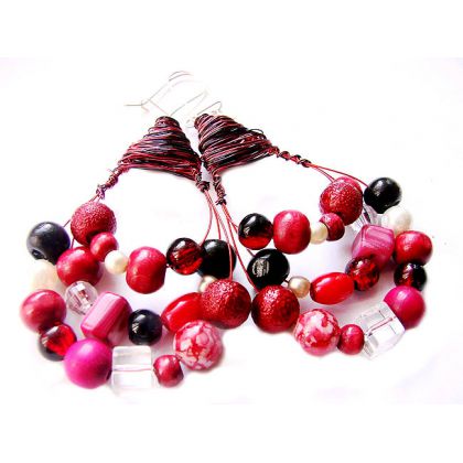 Kolczyki łezki wykonane z opalizujących szklanych koralików,koralików drewnianych i perełek na lince jubilerskiej. Całość ozdobnie oplatana czerwono czarnym drucikiem. Długość całkowita kolczyka wynosi 8 cm a bigle tak jak we wszystkich moich pracach wykonane są ze srebra próby 930.