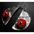 Mam przyjemność zaprezentować Państwu kolczyki półksiężyce z plastrami czerwonego naturalnego korala wykonane w technice tiffany lutowane przy użyciu stopu cyny i srebra.długość kolczyka wynosi 7,5 cm wraz z biglem całość patynowana i ręcznie polerowana.Bigle tak jak we wszystkich moich pracach wykonane są ze srebra próby 930.Zapraszam do zakupu.