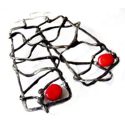 Mam przyjemność zaproponować Państwu autorskie kolczyki wykonane w technice Tiffany z odkuwanej ręcznie miedzi lutowane przy użyciu witrażowego stopu cyny i srebra. Ozdabiane owalami naturalnego czerwonego korala. Kolczyk ma wymiary 3 x 8,5 cm bigle wykonane są ze srebra próby 930.