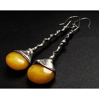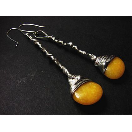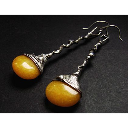 Mam przyjemność zaprezentować Państwu autorskie kolczyki wykonane w technice witrażowej z miedzi oraz 14 mm łezek bursztynowego nefrytu. Kolczyki lutowane przy użyciu witrażowego stopu cyny i srebra.Długość kolczyków wraz z biglami wynosi 8 cm. Bigle wykonane ze srebra próby 930.