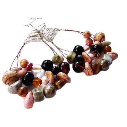 Kolczyki łezki wykonane z opalizujących szklanych koralików,koralików drewnianych i perełek na lince jubilerskiej. Całość ozdobnie oplatana posrebrzanym drucikiem. Długość całkowita kolczyka wynosi 8 cm a bigle tak jak we wszystkich moich pracach wykonane są ze srebra próby 930.