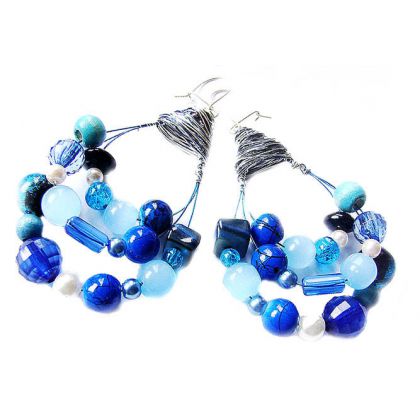 Kolczyki łezki wykonane z opalizujących szklanych koralików,koralików drewnianych i perełek na lince jubilerskiej. Całość ozdobnie oplatana posrebrzanym i granatowym drucikiem. Długość całkowita kolczyka wynosi 8 cm a bigle tak jak we wszystkich moich pracach wykonane są ze srebra próby 930.