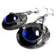 Mam przyjemność zaprezentować państwu autorskie kolczyki wykonane w technice witrażowej ze szklanych granatowych kaboszonów średnicy 18 mm i miedzi całość oksydowana i polerowana. Długość całkowita kolczyków wynosi 5,3 cm a do lutowania użyłam stopu cyny i srebra.