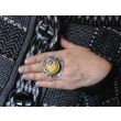 Mam przyjemność zaproponować Państwu autorski wykonany w witrażowej technice tiffany , lutowany przy użyciu ekologicznego stopu cyny i srebra.Oczko pierścionka stanowi 25 mm kamień bursztynowego nefrytu Średnica pierścionka to 3,8cm. Pierścień posiada regulowaną uniwersalną obrączkę zapraszam do zakupu